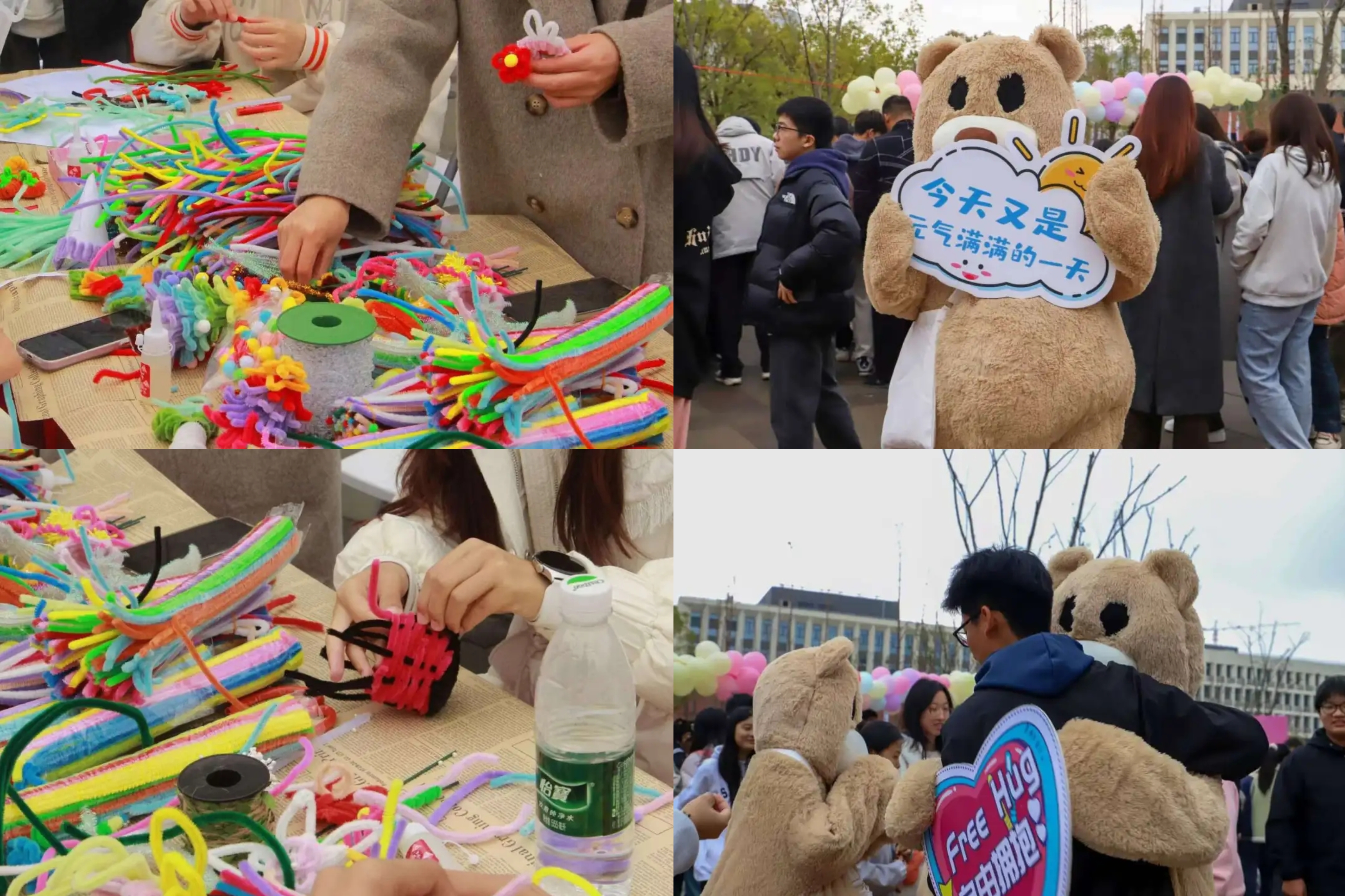 大学生心理健康教育中心开展了“生命之物,由你创造”“生命之色,彩韵生花”“生命之伴,随你回家”系列活动,通过DIY扭扭棒、扎花染织、“扔娃娃”等游戏,让同学们不断发挥自我创造,把笑容留在当下,让心灵创造美好。同时,同学们也在与小熊拥抱中,获得暖心的安慰与向上的勇气。“扎染、写心愿卡、流体熊DIY,这些活动我都参与了,来到这里,感觉心情都好了起来,完全符合我对学校心理活动的期待!”2024级计算机科学与技术专业的廖斌同学说道。