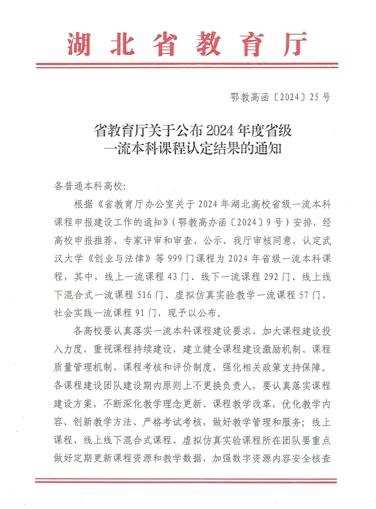 近日,湖北省教育厅发布了《省教育厅关于公布2024年度省级一流本科课程认定结果的通知》(鄂教高函〔2024〕25号),我校共有7门课程获批2024年度省级一流本科课程,其中,社会实践课程1门,线上线下混合式课程6门。