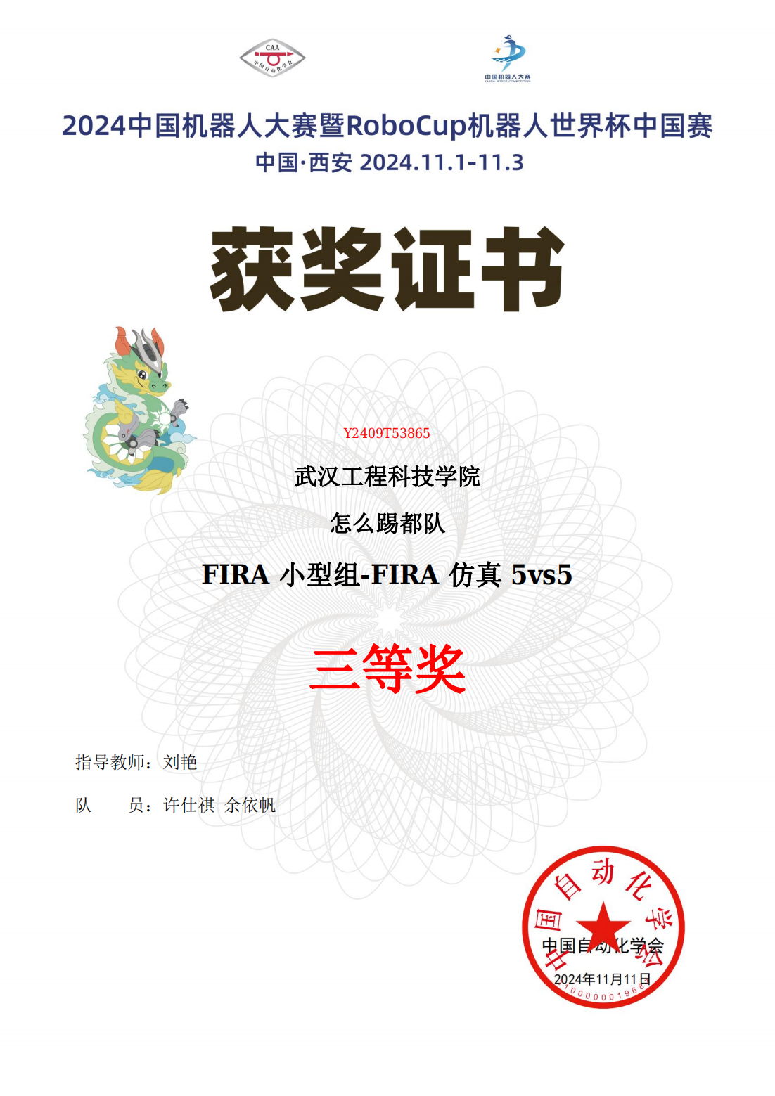 近日,由中国自动化学会、西安市人民政府主办的2024中国机器人大赛全国总决赛在西安市国际会展中心成功举办。我校学生许仕祺、余依帆在计算机与人工智能学院计算机系主任刘艳的带队下参加了本次大赛,并荣获FIRA小型组仿真5v5项目全国三等奖。