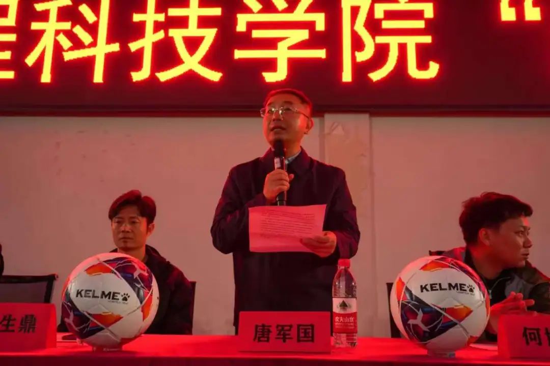 唐军国致辞。他首先代表学校向全体师生、运动员、裁判员及工作人员表示衷心感谢和高度赞扬。他表示,“新生杯”足球赛不仅有利于丰富我校足球文化,更是培养、选拔优秀足球人才的重要途径。他希望,裁判员能保持优良作风,认真负责,坚持标准,严格执法;运动员能顽强拼搏,超越自我,展现良好的竞技水平和精神风貌;全体师生能积极为运动员们喝彩,发扬运动员身上不畏困难、团结协作、敢于奋斗的精神。