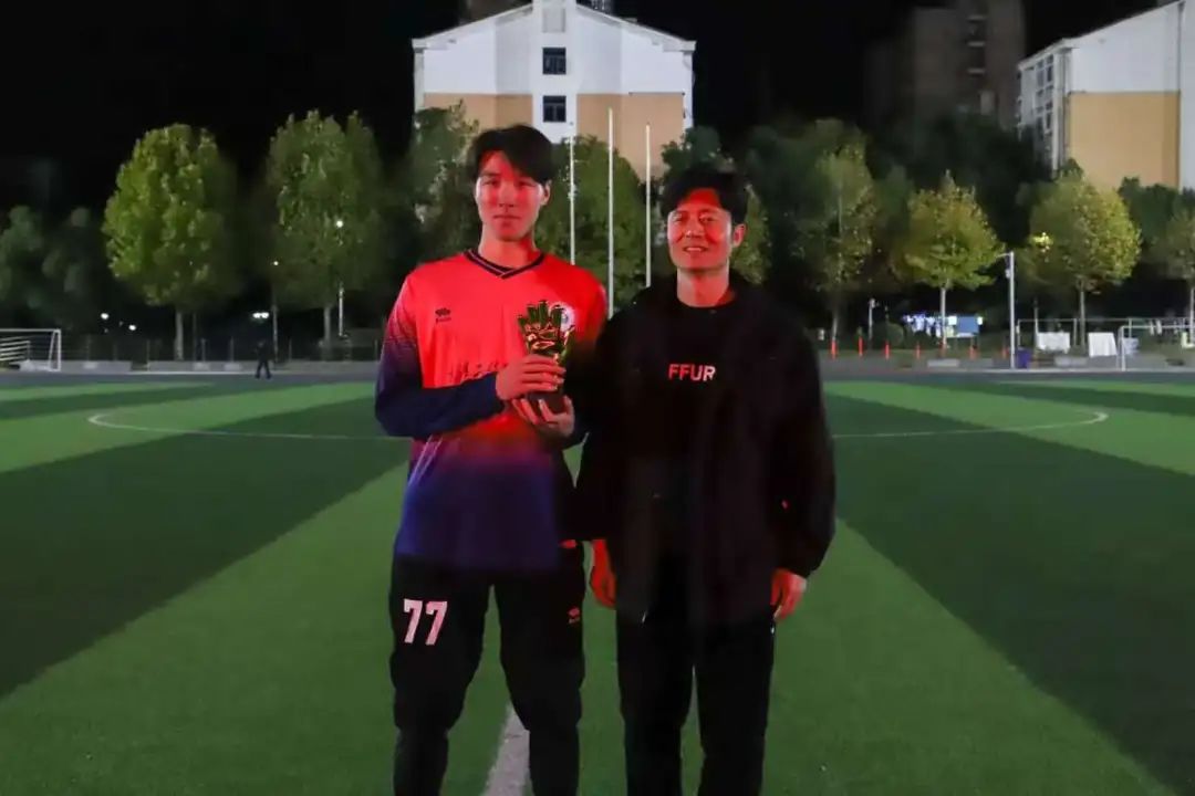 校足球队主教练体育系教师柳晨为希望之星高润鑫、吴亦堔颁奖。