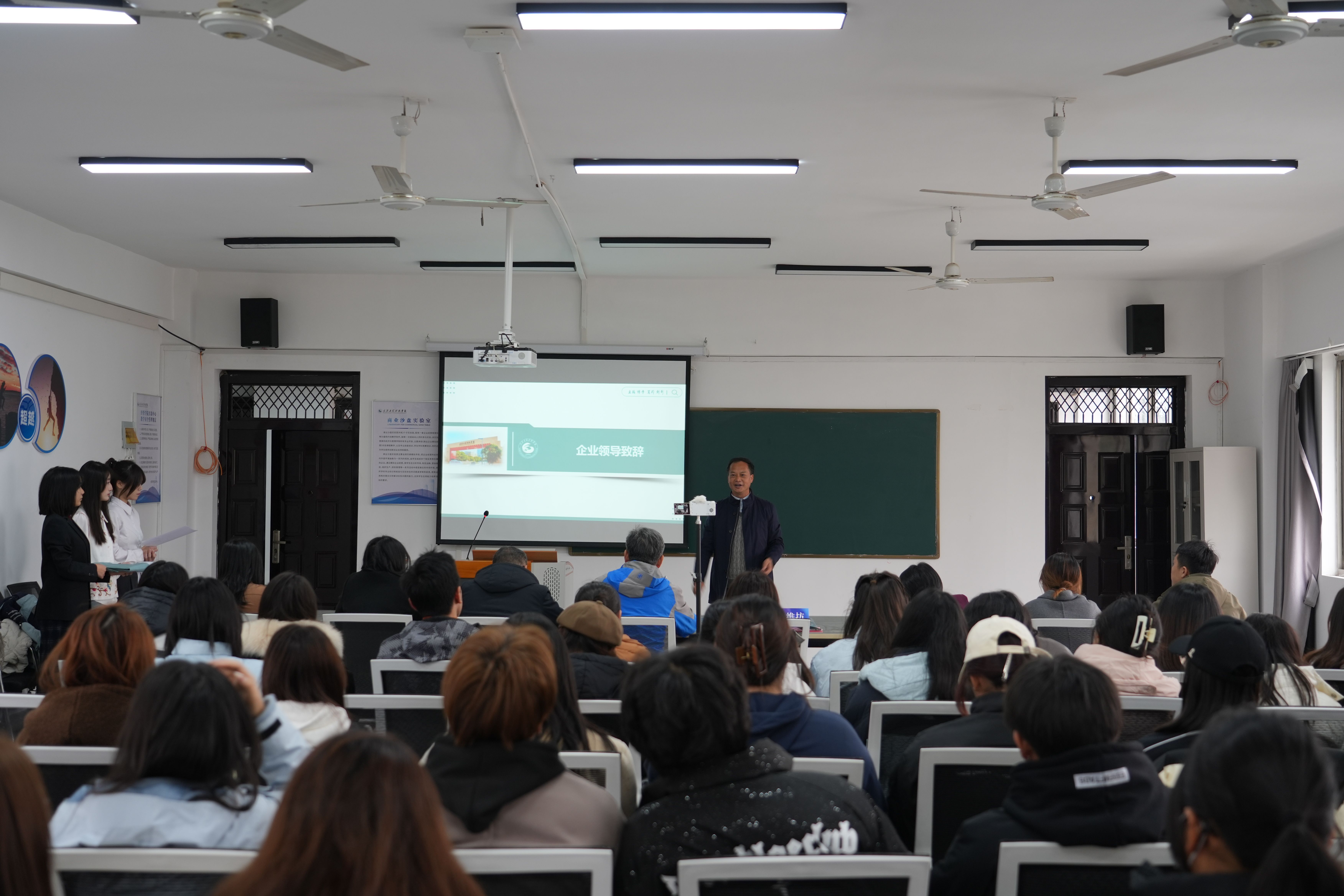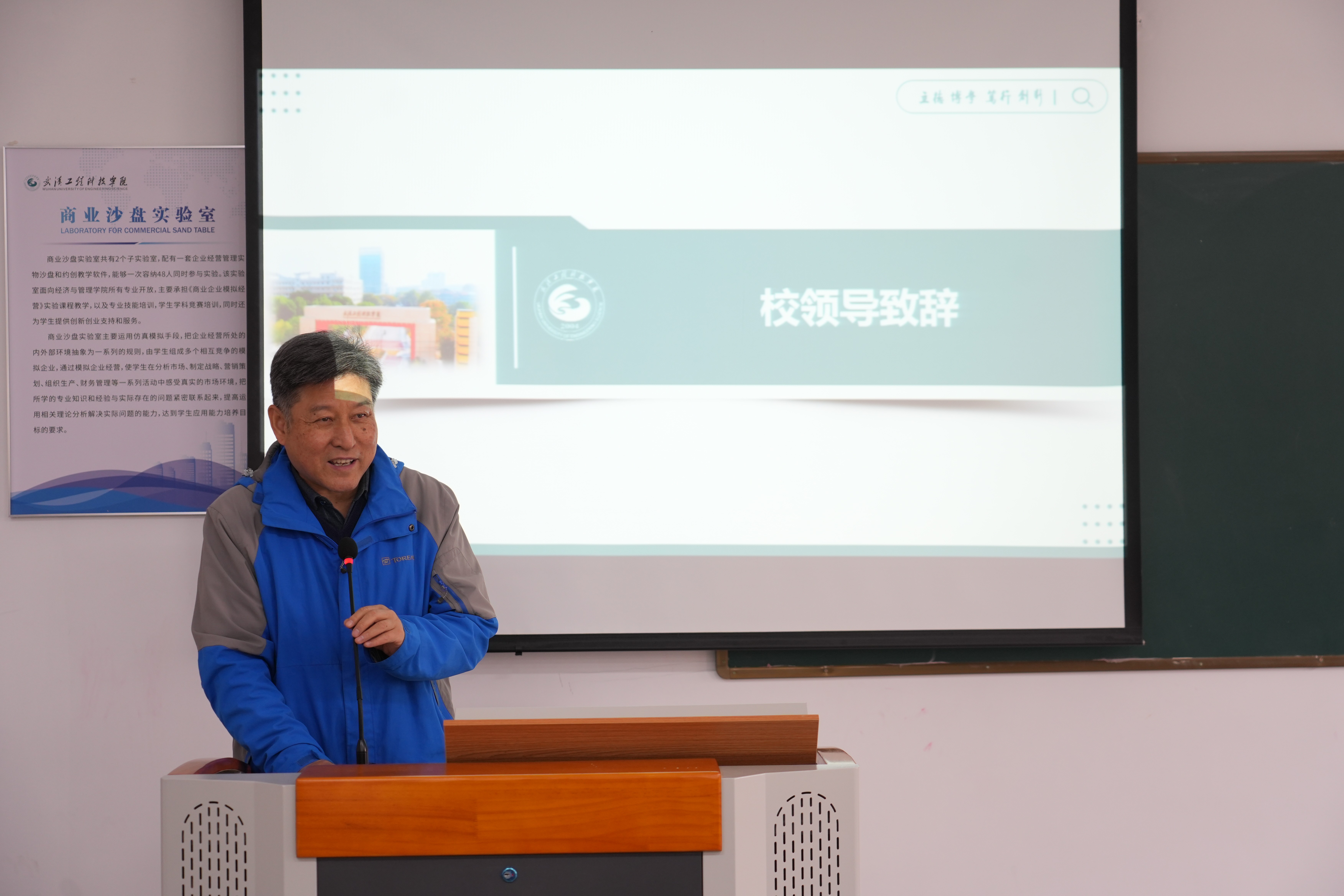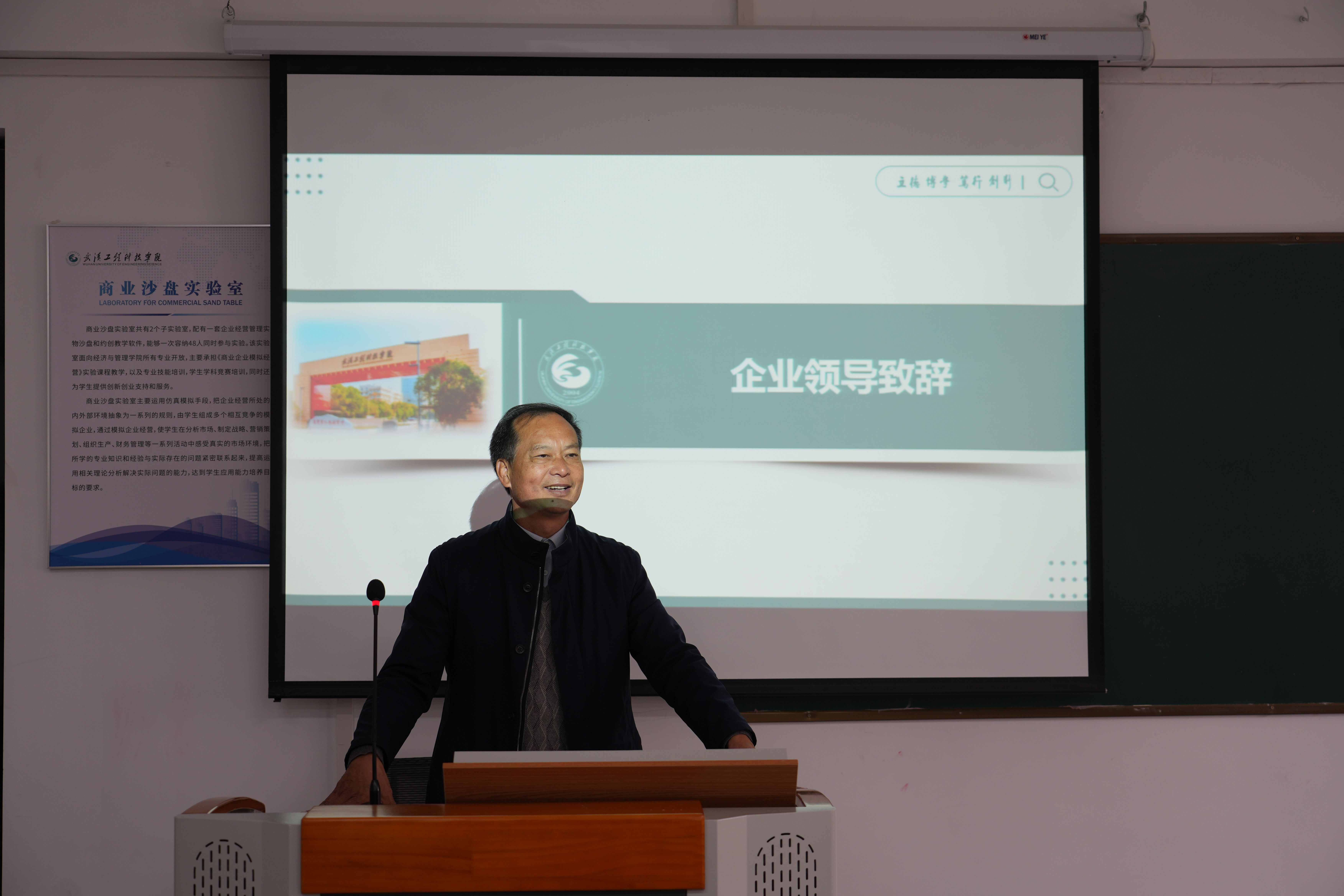 本网讯(大学生见习记者 张颖 李木子 摄影 谢含笑 )为搭建学校、学生、企业三方交流沟通的平台,树立合作共赢意识,强化校企合作关系,12月11日下午,武汉工程科技学院“空间交互直播”人才训练营开班仪式在二号教学楼举行。湖北未来家园高科技农业股份有限公司董事长尹维坊、产业研学院负责人王皂香、胡亦寒,学校党委常委、副校长杨伦,经济与管理学院党政负责人以及教师代表参加本次活动。