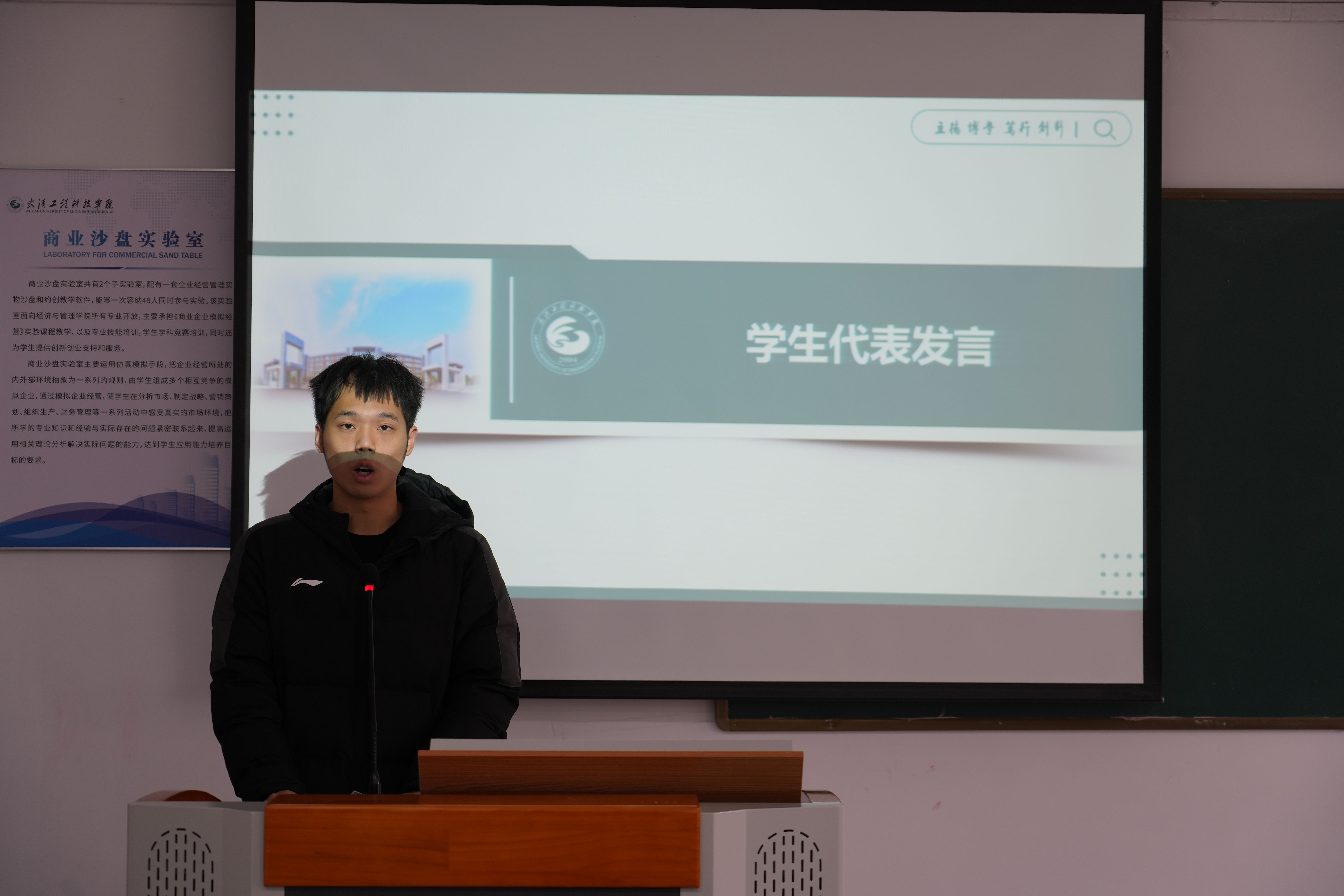 学校电商直播协会运营部部长胡咏鑫作为学生代表发言。他首先对学校表示诚挚的感谢。他表示,自己将珍惜学校为学生们所搭建的平台,在实践操作中不断提升专业技能、适应职场环境、培养职业素养。他希望通过与企业代表的互动交流,能对未来的职业规划有更为清晰的认识。最后,他相信在校企合作的引领下,跨越重重挑战,成为适应时代发展需求的创新型人才。