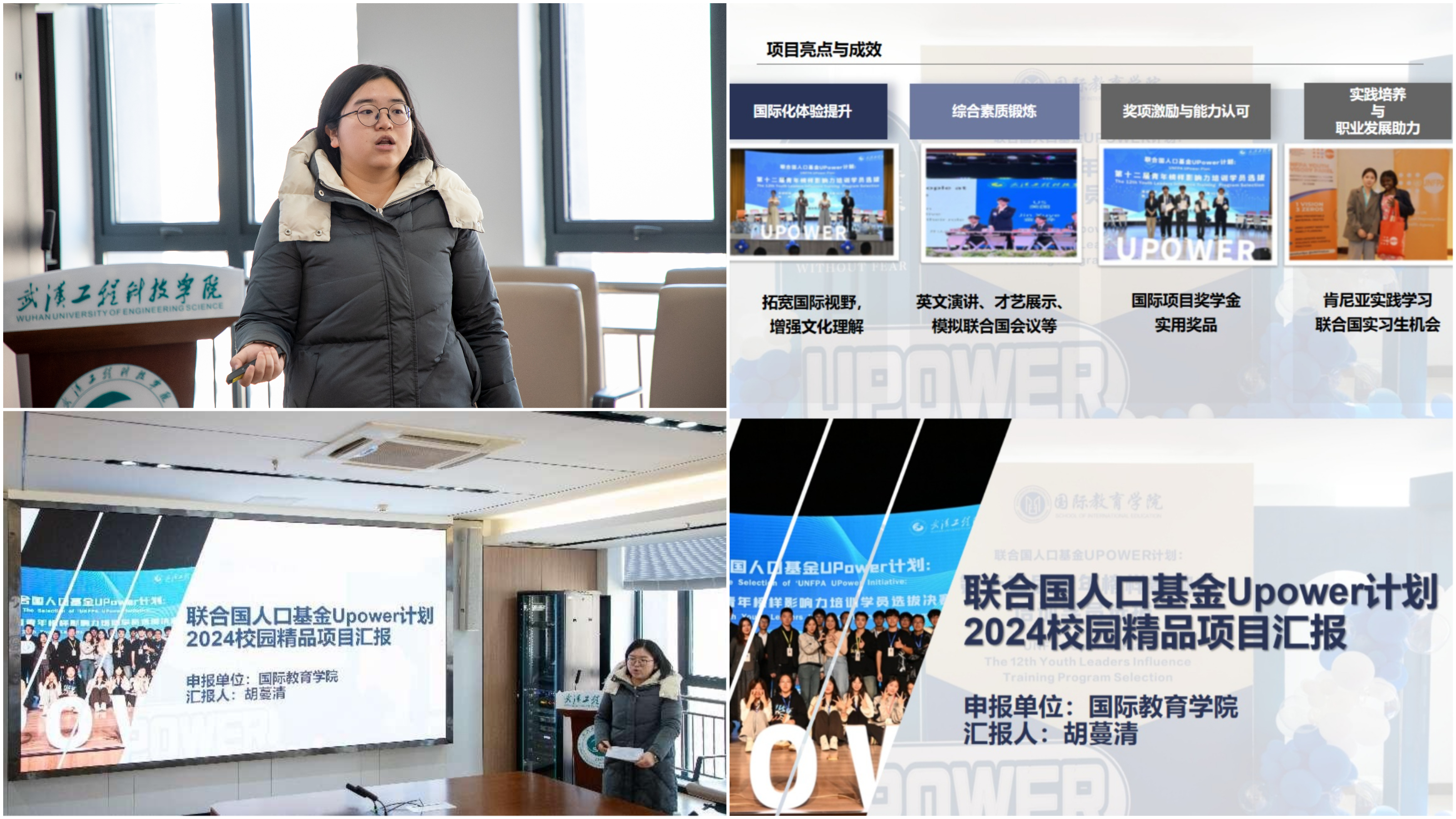 国际教育学院胡蔓清就联合国人口基金UPower计划活动项目进行汇报。她提到,该项目参与人数达1600余人,致力于提升学生的国际化实践能力及综合素质,为学生的实践与职业发展提供了有力支持。
