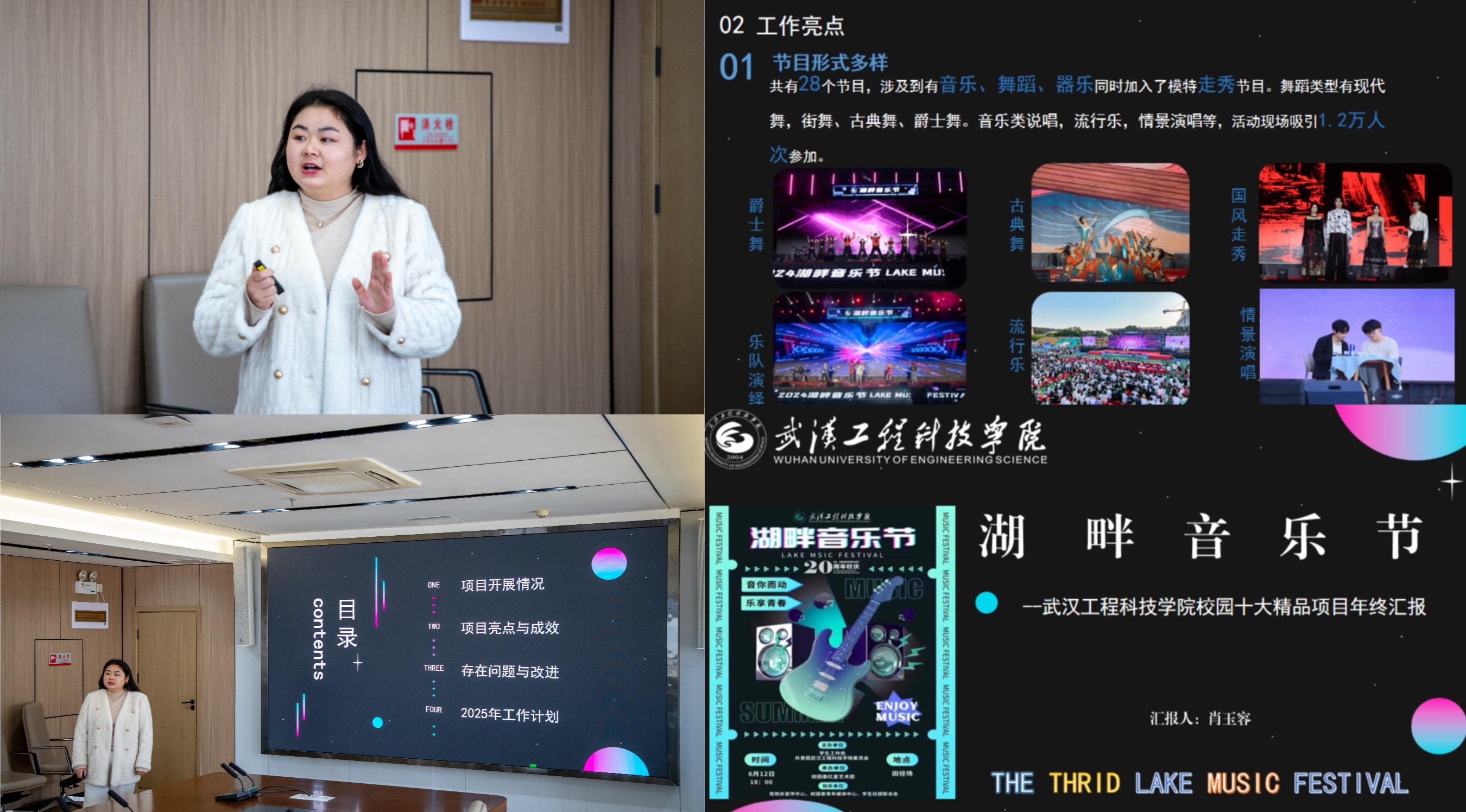 至此,武汉工程科技学院 2024 年“十大精品”活动项目年终汇报会圆满落幕。本次汇报会全面回顾了年度精彩活动项目,总结经验,凝聚力量,为学校未来发展铺就坚实基石。
