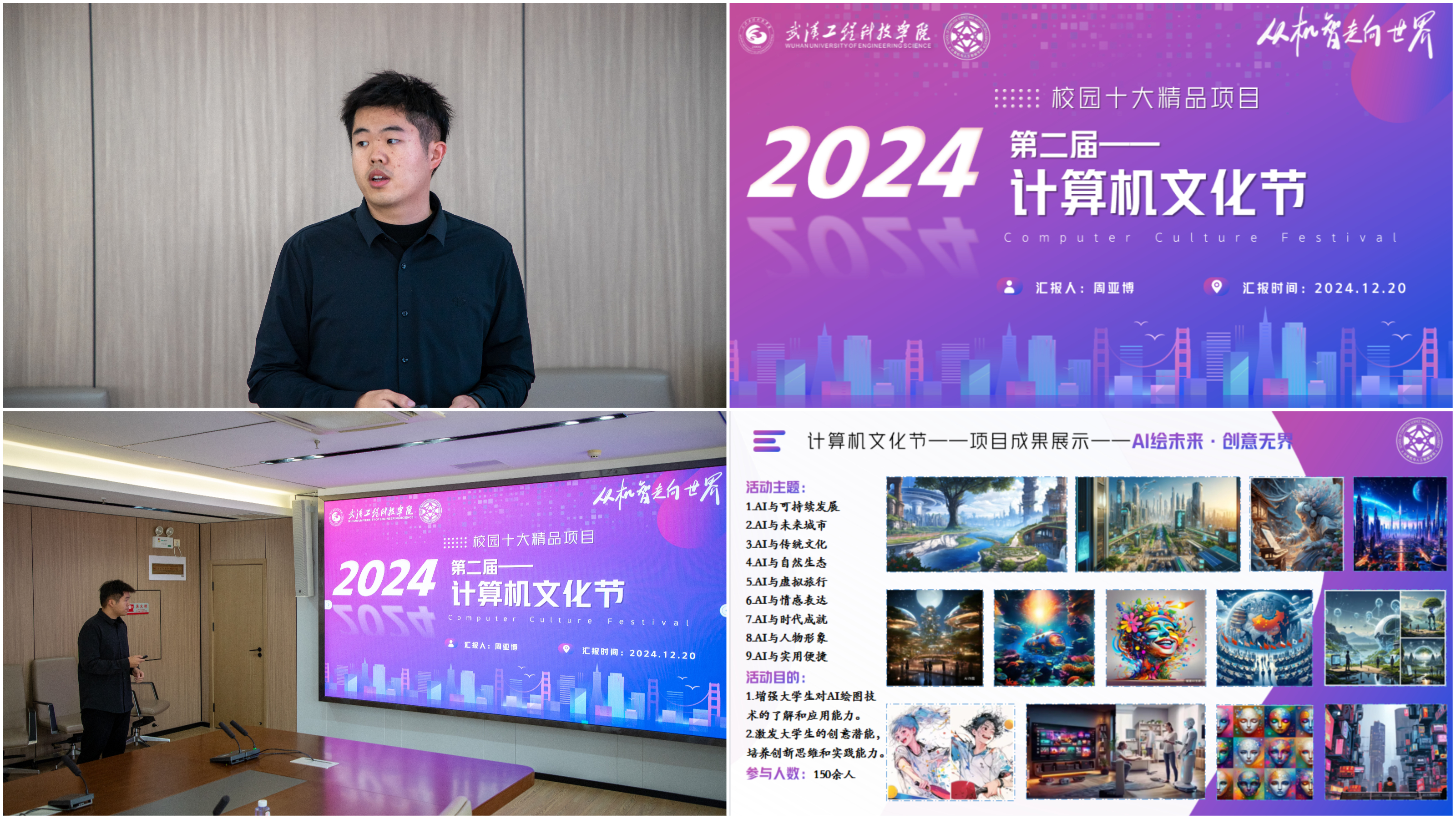 计算机与人工智能学院周亚博对计算机文化节活动项目进行汇报。该项目旨在普及计算机技术的最新进展,展现计算机文化的独特魅力,激发学生对计算机技术的浓厚兴趣和热情,提升学生的计算机实践能力,拓宽其知识领域和视野,促进校园内计算机文化的深入传播与交流。