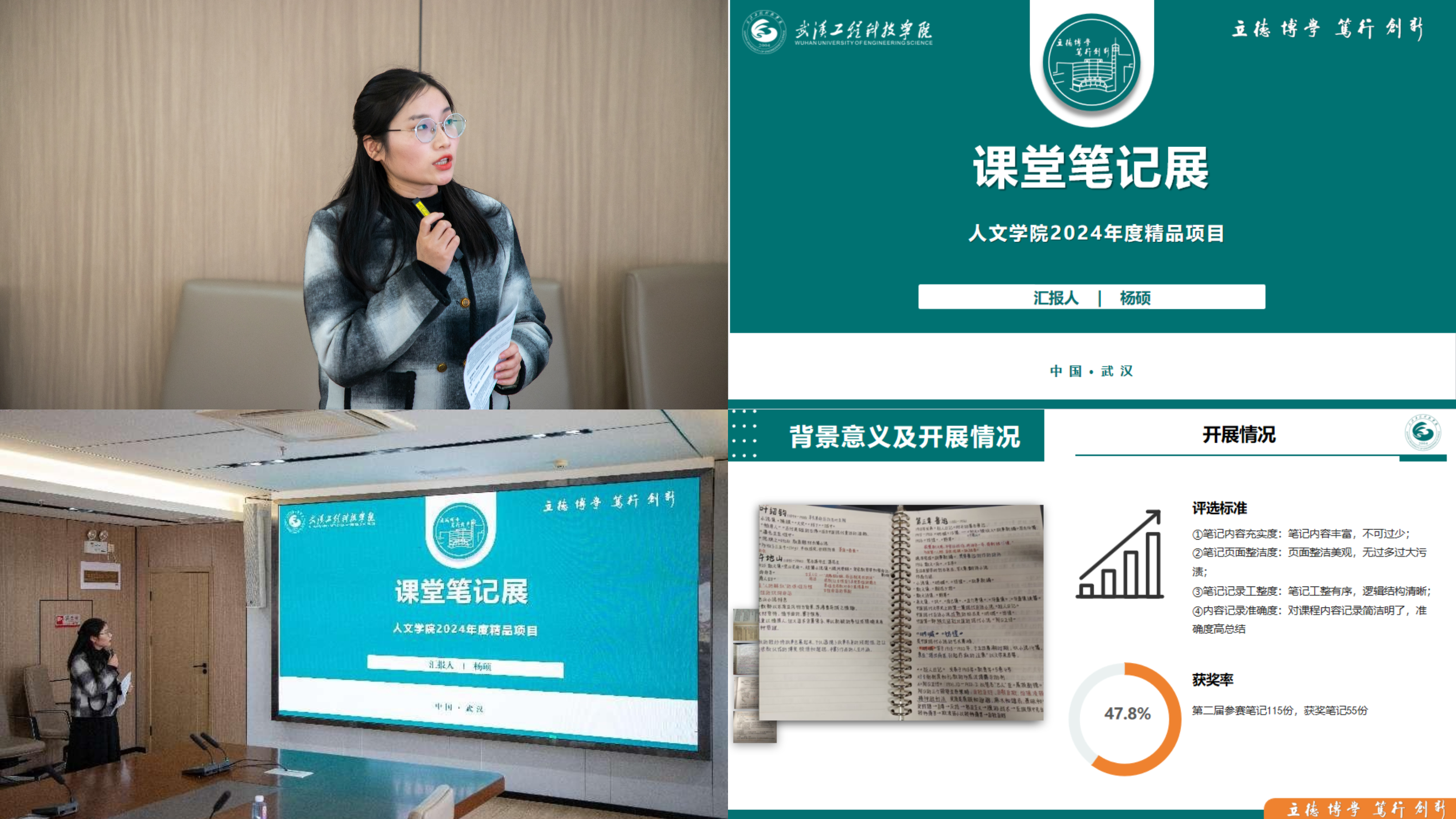 人文学院杨硕对课堂笔记展活动项目进行汇报。该活动持续时间长、辐射范围广,2023年共征集到参赛作品92份,其中30份获奖,2024年参赛作品增至115份,获奖作品达到55份。她相信,通过这些具有针对性举措的落地实施,不仅能够有效地激发学生们的学习热情与创造力,还将在学院内部营造出更为浓郁的学术氛围,为培养具有深厚文化底蕴、创新精神和自主学习能力的高素质人才奠定坚实基础。
