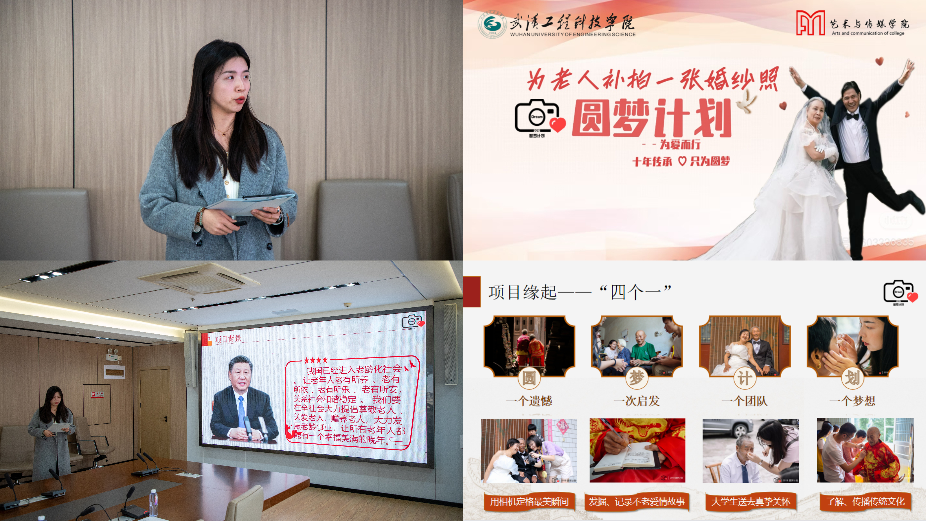 艺术与传媒学院陈雨果对圆梦计划活动项目进行汇报。该项目获得2024年第8届大学生艺术优秀文艺节目省级二等奖,2024年“公益之星”卓越公益团队奖等众多奖项。活动为2500余名老人拍摄了近7万张婚纱片,举办了8场摄影展,足迹遍布中国多地,并连续多年登顶武汉市热搜榜,具有广泛的影响力。
