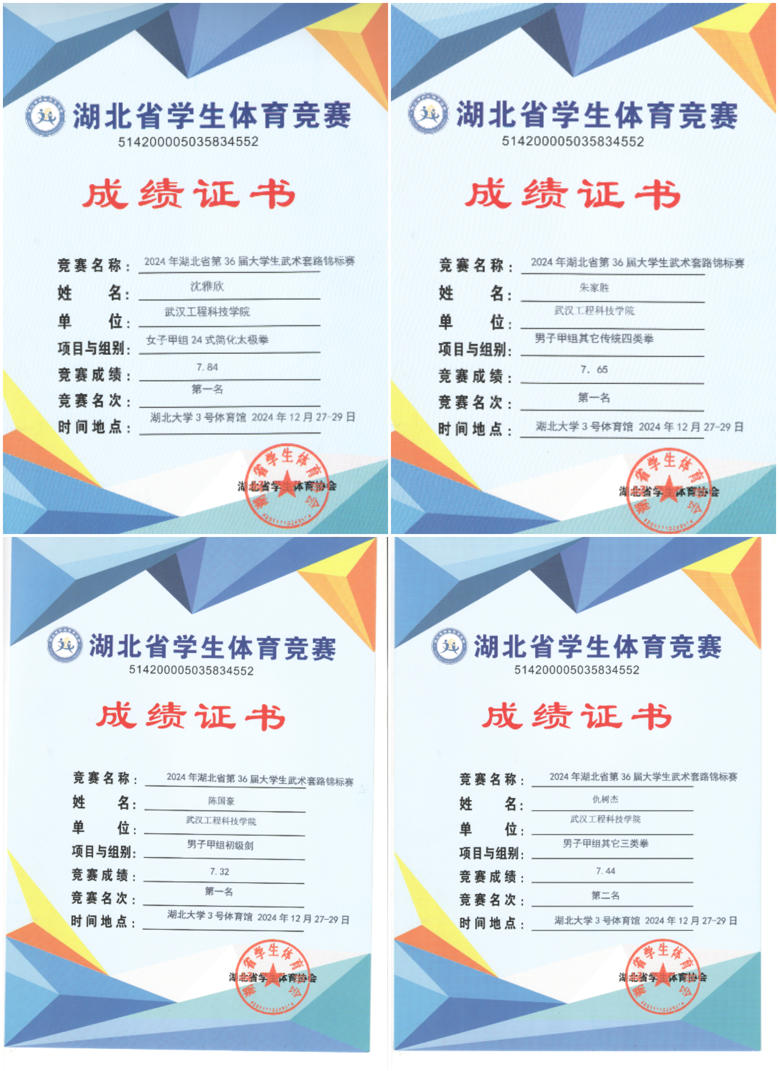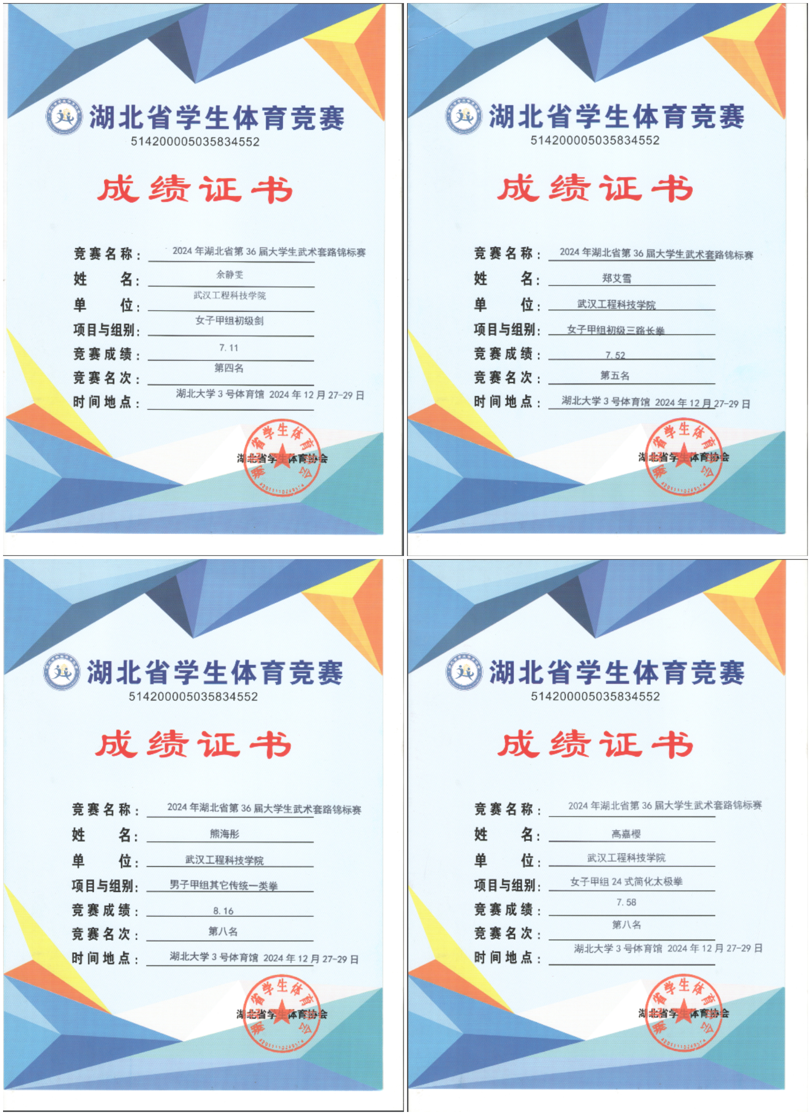 2024年湖北省第36届大学生武术套路竞标赛由湖北省大学生体育协会主办,共有包括华中师范大学、武汉理工大学、中南财经政法大学等46支代表队,共500余名运动员参赛。