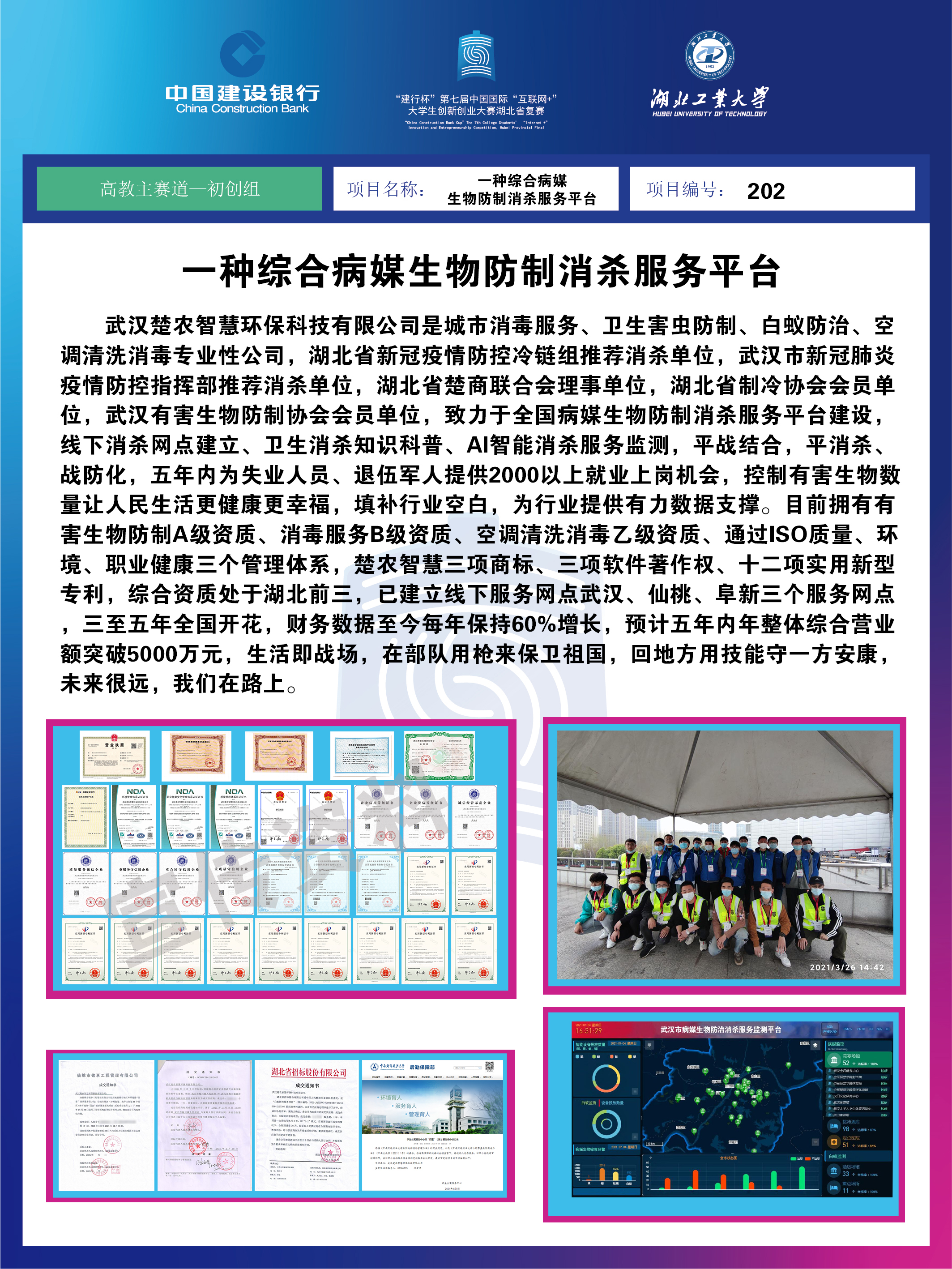 7月30日晚,第七届中国国际“互联网+”大学生创新创业大赛湖北省复赛在湖北工业大学落下帷幕。经过两天的角逐,我校参赛项目“楚农智慧环保—一种综合性病媒生物防治消杀服务平台”成功入围金奖排位赛,斩获学校在该项赛事上的第一枚金牌。至此,在本届大赛中学校共赢得1项金奖、1项银奖、2项铜奖以及1项专项奖,创造了历届参赛的最好成绩。