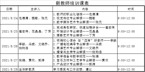 本网讯(通讯员 乔乔)2021年8月24日-28日,艺术与传媒学院2021年秋季新进教师培训在腾讯会议进行,院长包德清,常务副院长崔宏伟,党总支书记李毅,教学副院长张娟,各教研室主任及全体新进教师参加会议。