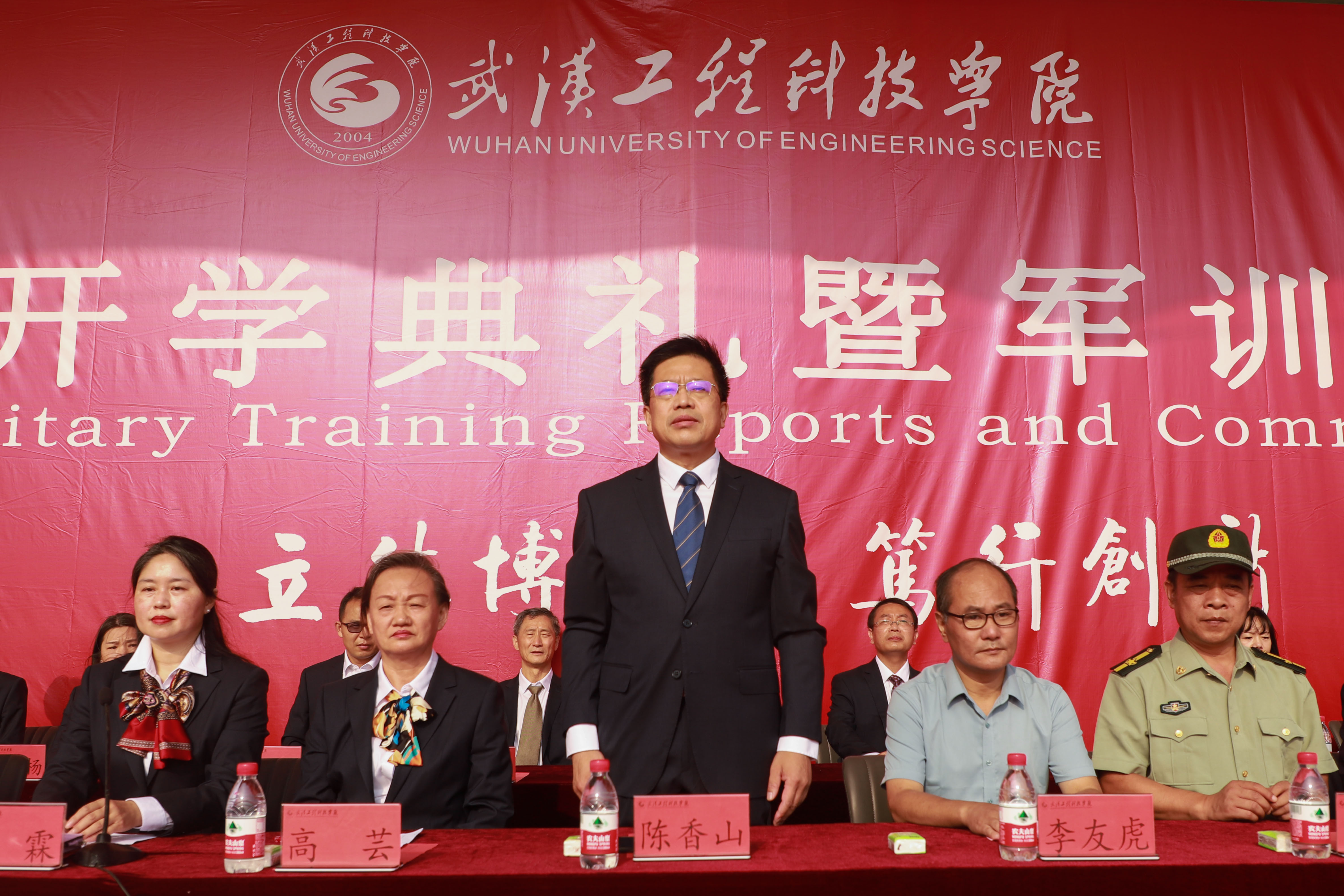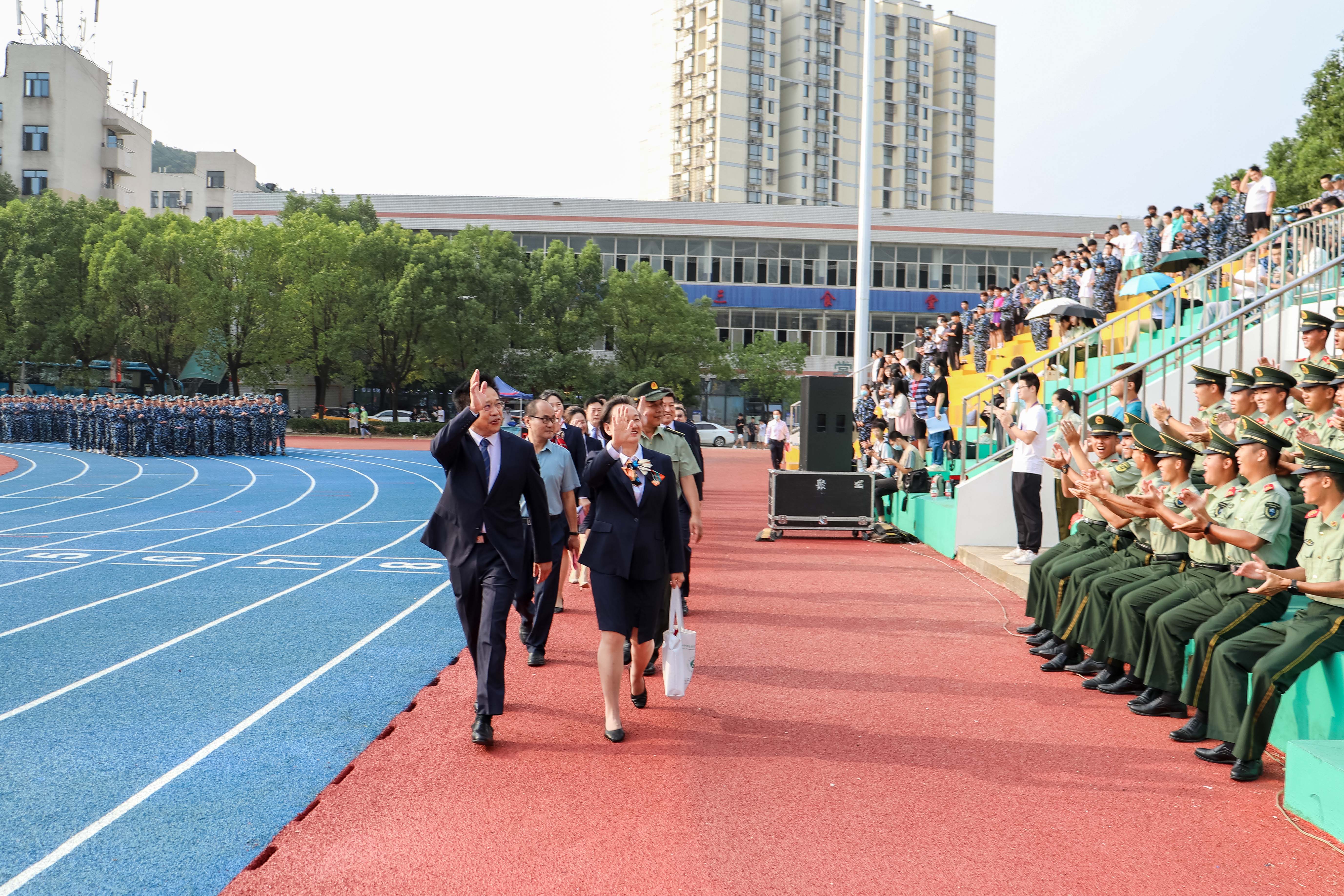 执行董事陈香山在主席台向学生致意并宣布军训成果汇报开始