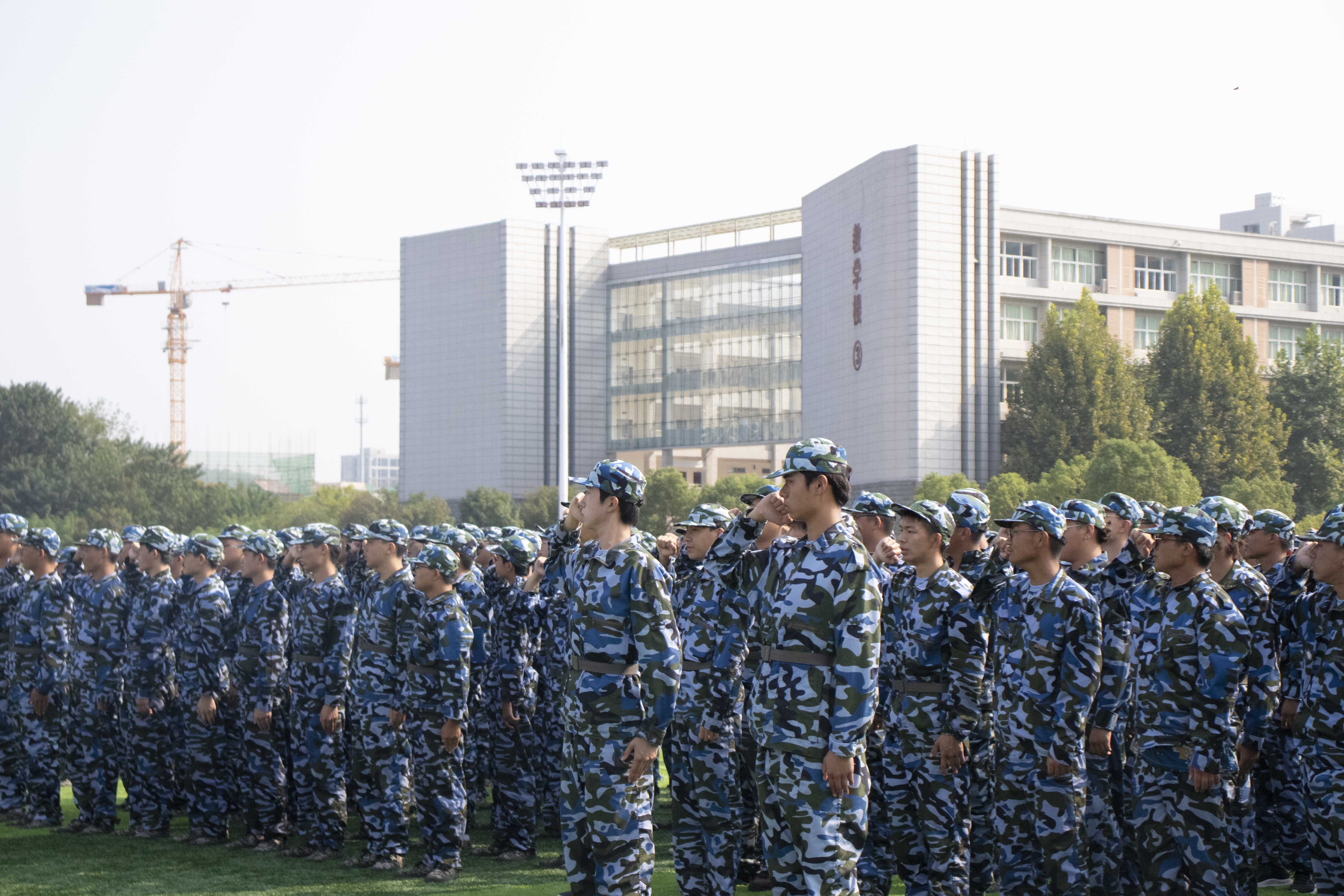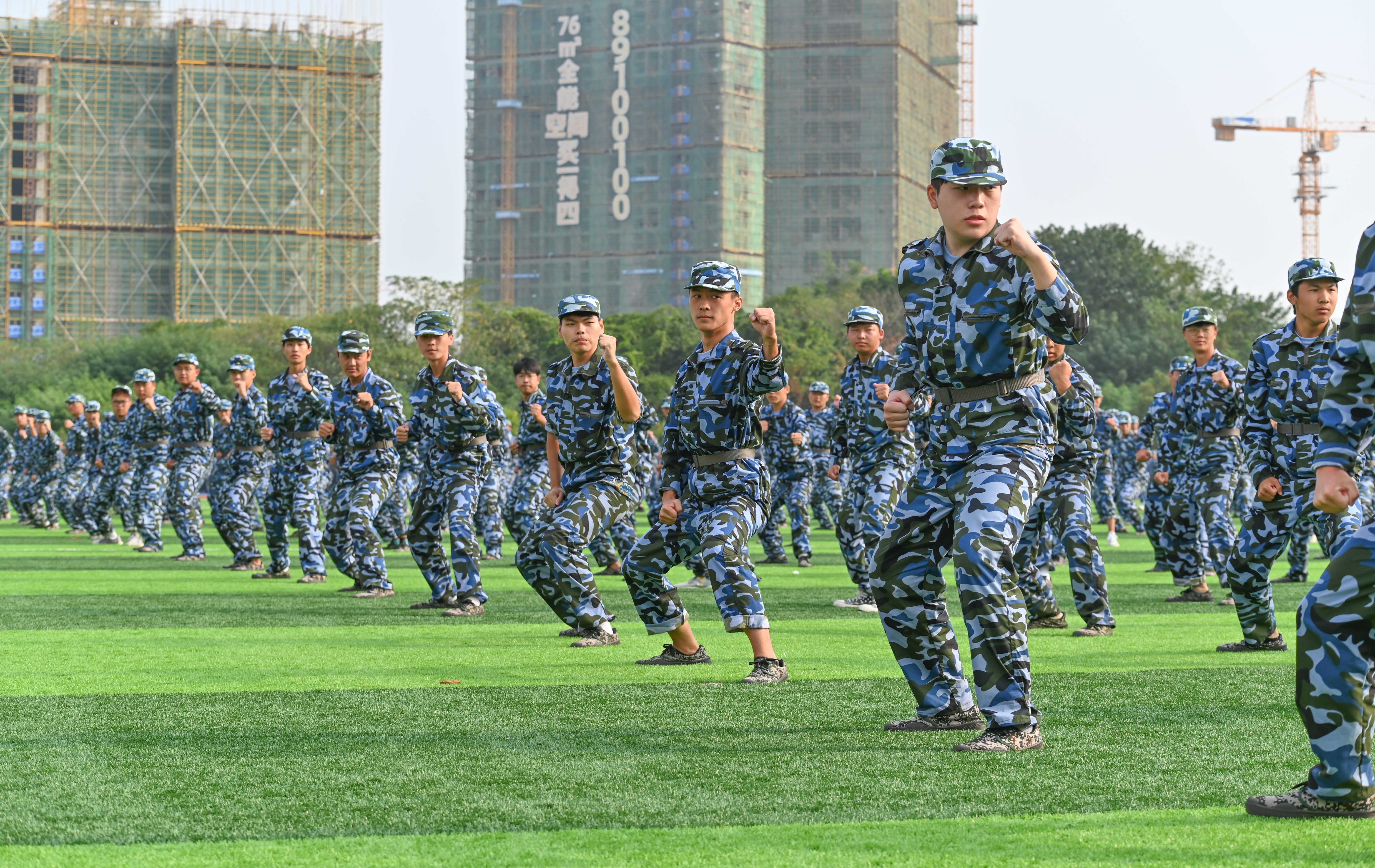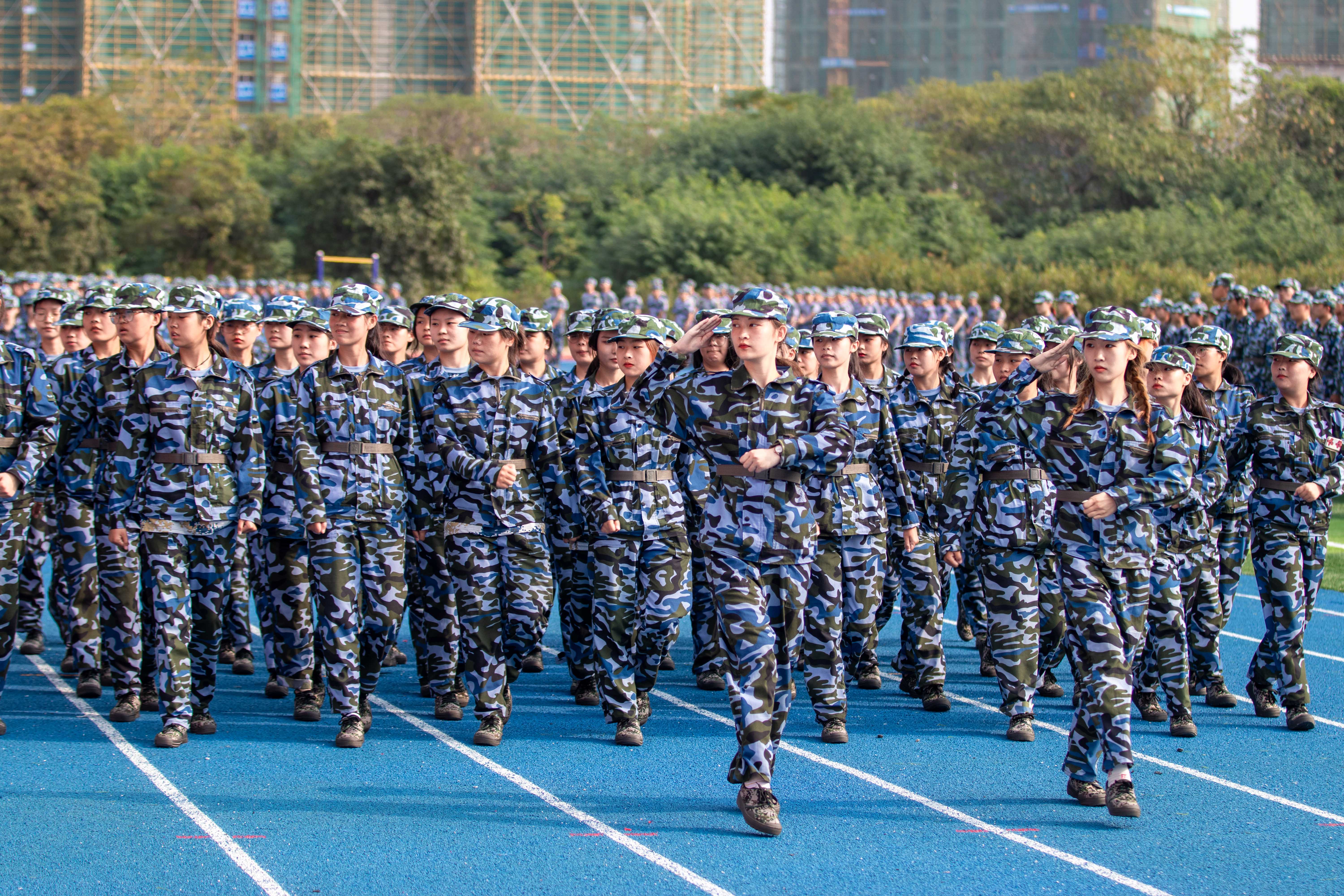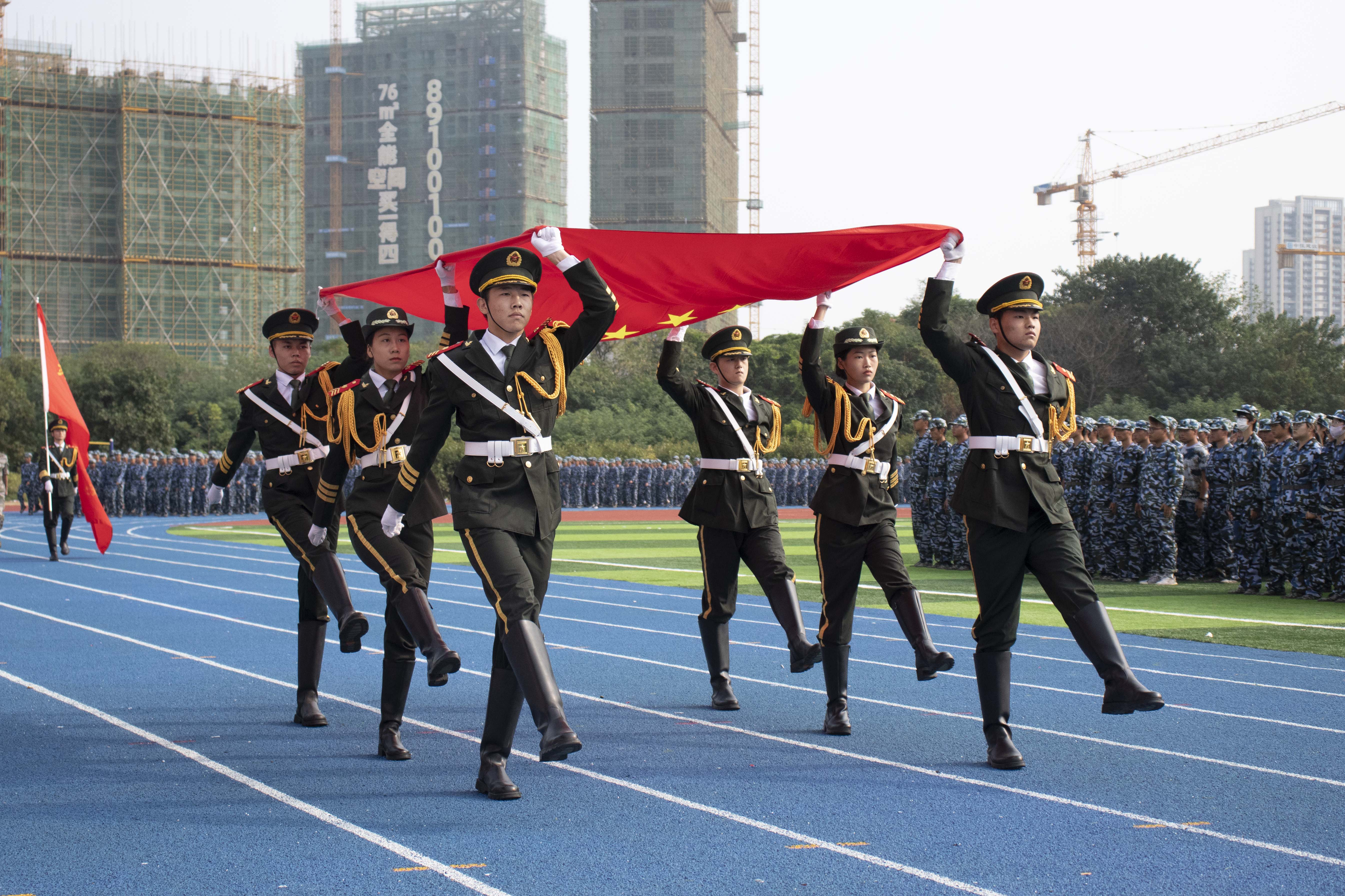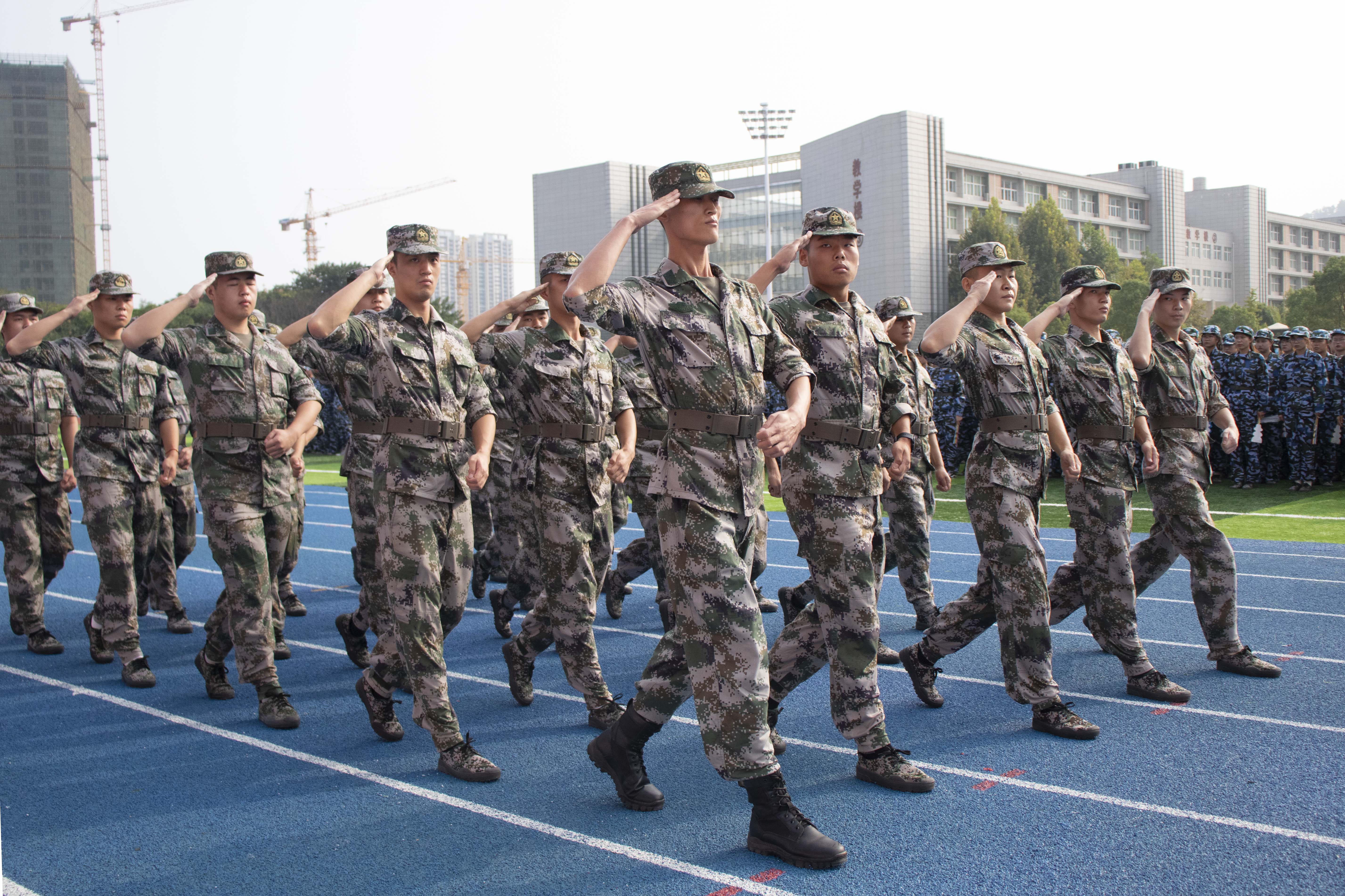 分列式进场,由学校退役士兵组成的方阵和新生方阵入场,他们迎着骄阳不断前进,步伐整齐、眼神坚定。