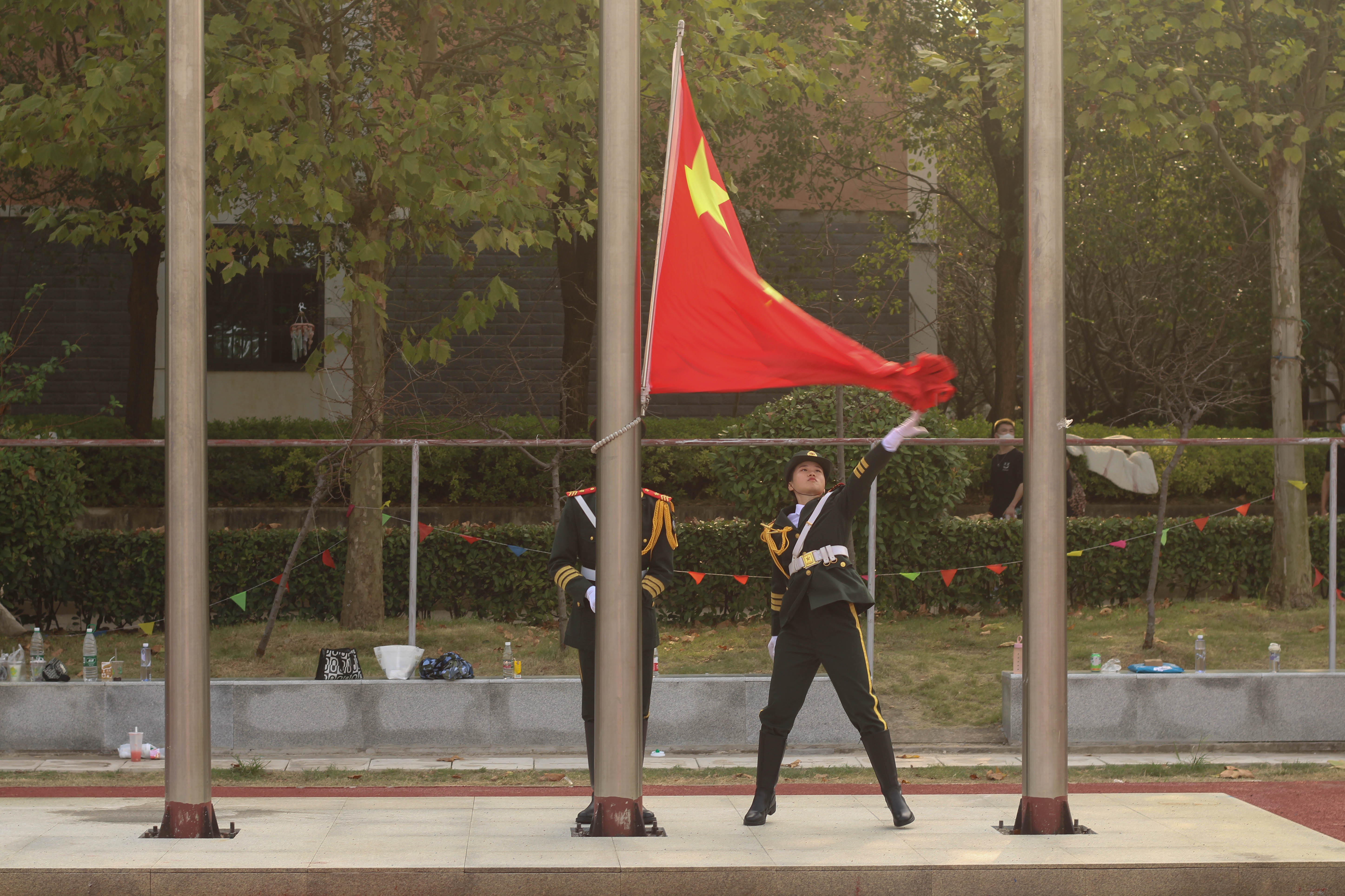 校国旗护卫队踏着坚定的步伐入场,在庄严的国歌声中,全体师生完成了升国旗仪式,军训成果汇报正式开始。