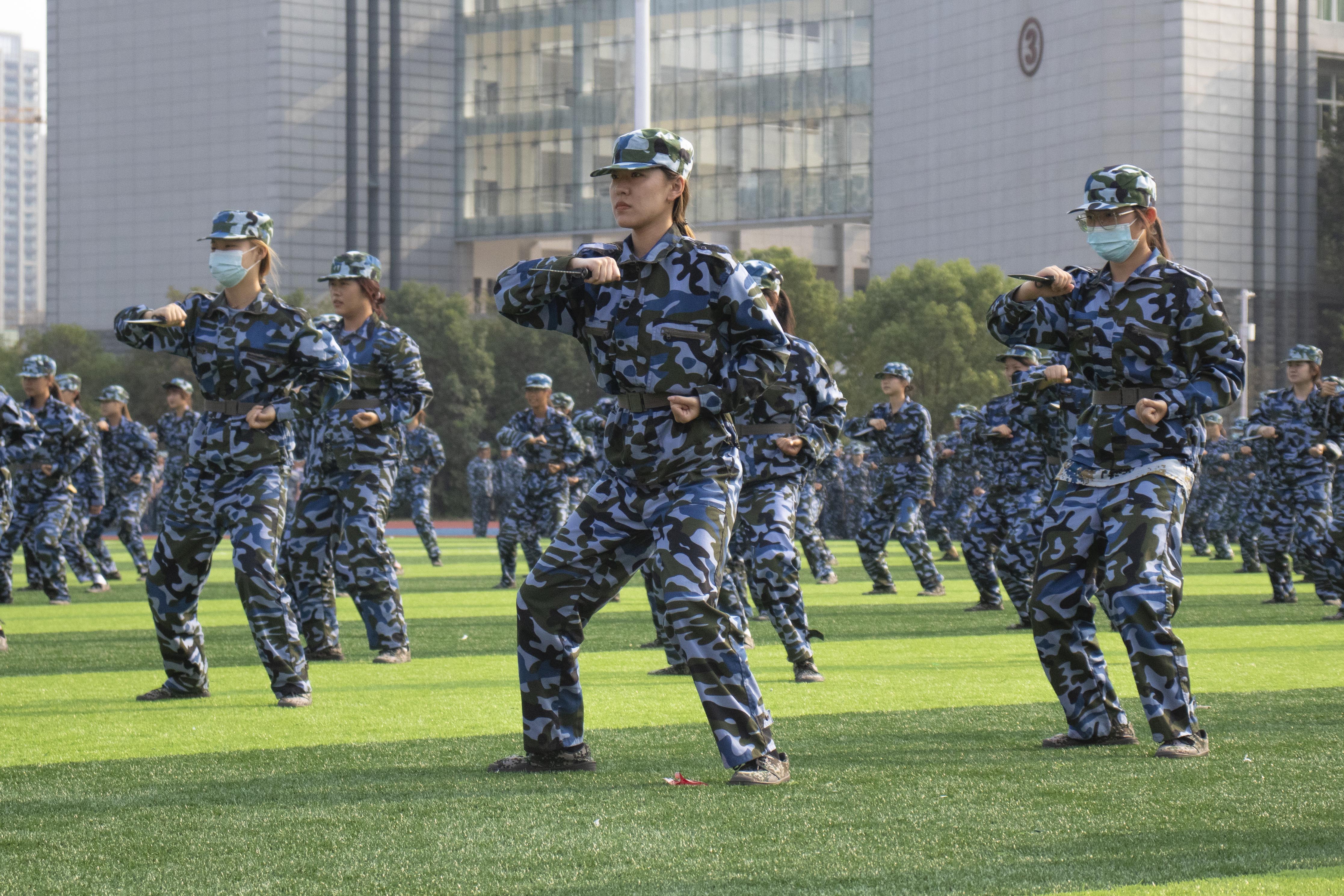 手握刀柄,拳峰向上,匕首操方阵女生们英姿飒爽,肆意挥洒汗水。阳光的洗礼使得她们皮肤黝黑,军绿色的身影下,跃动的是一颗颗年轻而充满激情的心。