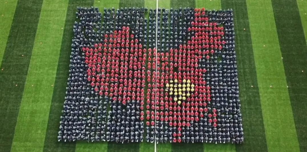 由1200名女生组成的花样方阵通过变换手中扇形花束,摆出“中国”“党徽”“校徽”“校训”等图案,在表演中展现对祖国、中国共产党的热爱以及对武工院的热爱。