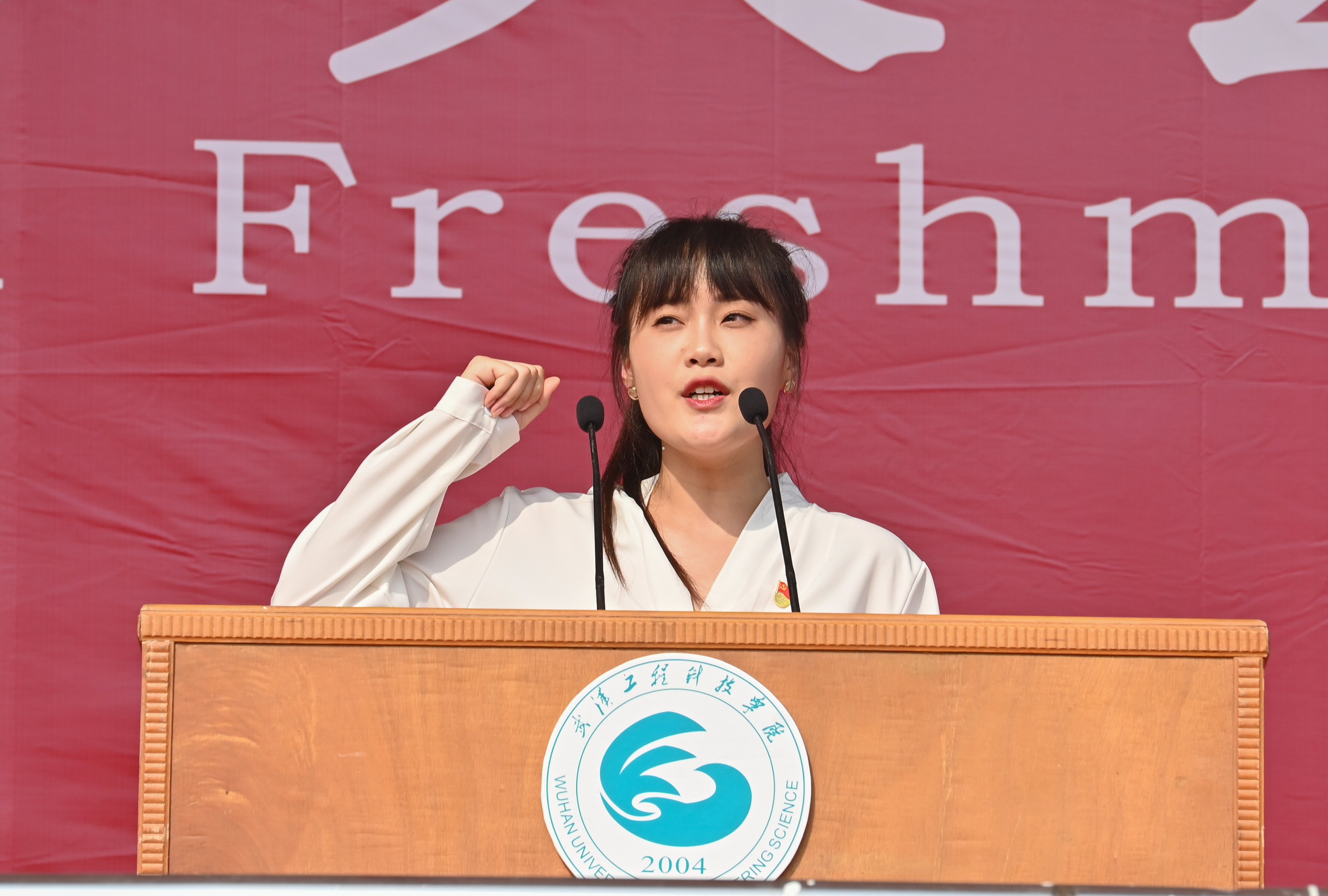 校团委学生会主席姚姗带领全体新生进行入学宣誓,“从今天起,我光荣地成为了一名武工院学子,在这里,我立志做一个有理想、有追求、有担当、有作为、有品质、有修养的大学生……”