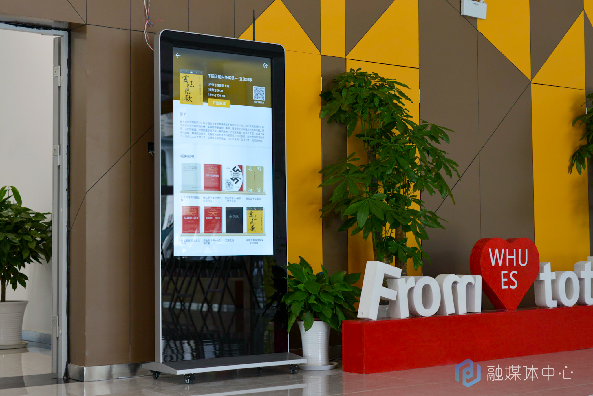本网讯(通讯员 邵小琪 摄影 李文熹)2021年10月21日上午,学校综合楼一楼新增一座云端数字图书馆-中文在线数字阅读屏。数字阅读屏由江夏区委宣传部捐赠给我校,是2021“书香江夏”全民阅读数字公共服务平台项目的一部分,除此之外,江夏区委宣传部还向学校捐赠1200张全民阅读卡。