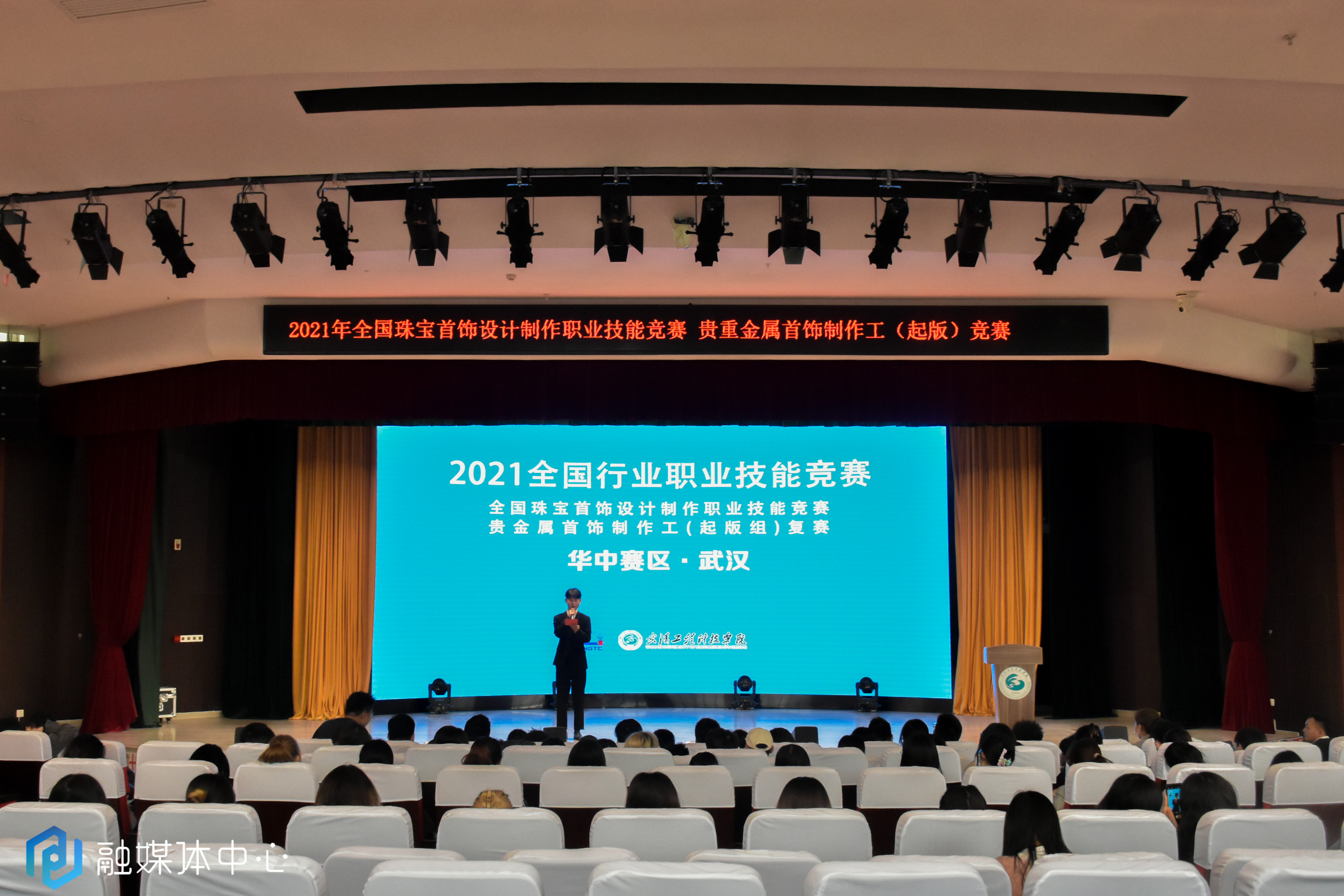 本网讯(大学生记者周思雨 郭一凡 摄影刘涵毓 潘力)为弘扬工匠精神,培养和选拔珠宝行业首饰制作与检验高技能人才,10月22日下午, 2021年全国行业职业技能竞赛——全国珠宝首饰设计制作职业技能竞赛华中赛区复赛的开幕式在我校图书馆多功能报告厅举行。党委书记高芸,艺术与传媒学院院长包德清,常务副院长崔宏伟,党总支书记李毅等领导出席开幕式,产品设计教研室的老师和产品设计专业的同学们参加了本次开幕式。