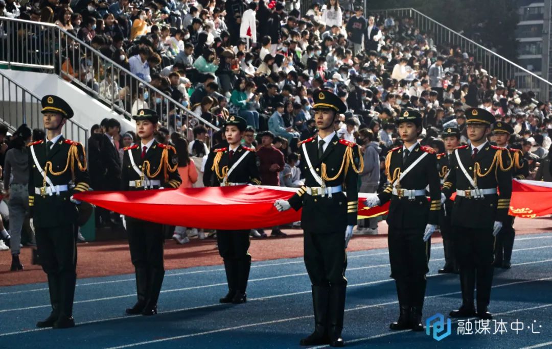 随着《运动员进行曲》响起,各方阵准备就绪,仪仗队举着五星红旗向主席台走来,整齐的步伐,挺拔的身姿,响亮的口号吸引着观众的目光。