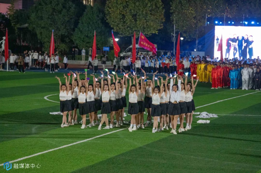 随后,各学院组织的花式方阵表演为运动会拉开序幕。《错位时空》团体操表演队中,红黄双面伞象征着勇敢与希望,他们在方阵的不停变换中相继摆出了“五环”、“武工院”、“2021”等图案。紧接着,在《我爱你中国》的背景中,由体育教研室表演的国标舞点燃全场,而太极表演则张弛有度,在柔和的动作中藏着几分刚劲。人文学院表演队中,一群身着红裙,手拿红纱的同学带来歌舞表演《万疆》。