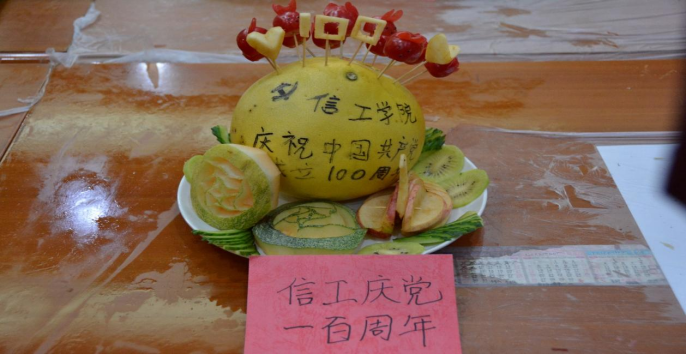 简介:小船是以哈密瓜为基础,胡萝卜、柚子为点缀来制作的,它象征着中国共产党在嘉兴南湖的小船上诞生,以此庆祝中国共产党成立一百周年,哈蜜瓜在民间象征健康兴旺,青春长存的寓意,以哈密瓜来做船身,祝福中国共产党永远年轻,充满活力。旁边的天鹅是武工院明心湖的志愿鹅和呆萌鹅共同祝愿武工院学子能够与人为善,将心比心,努力丰富人生阅历,祝愿武工院在未来的日子里人才辈出,扬帆起航!
