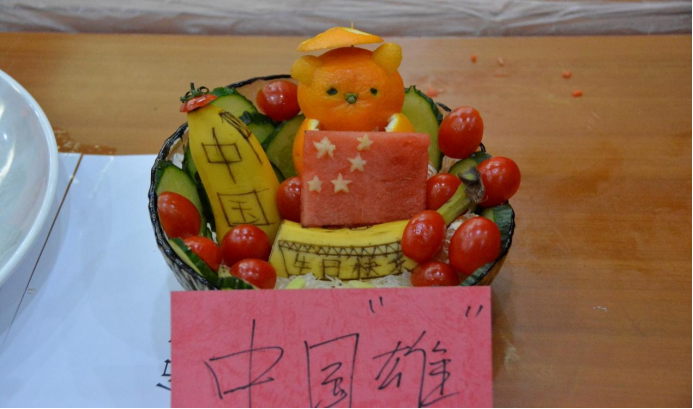 简介:以橙子制作的熊为主要元素,寓意祖国更加雄伟壮阔。黄瓜、圣女果、奇异果作为背景作为祖国的大好河山,红绿元素寓意绿水青山,人民生活幸福安康。由西瓜和苹果制成的五星红旗代表人民团结一心共筑美好中国,为自己是中国人感到骄傲和自豪。