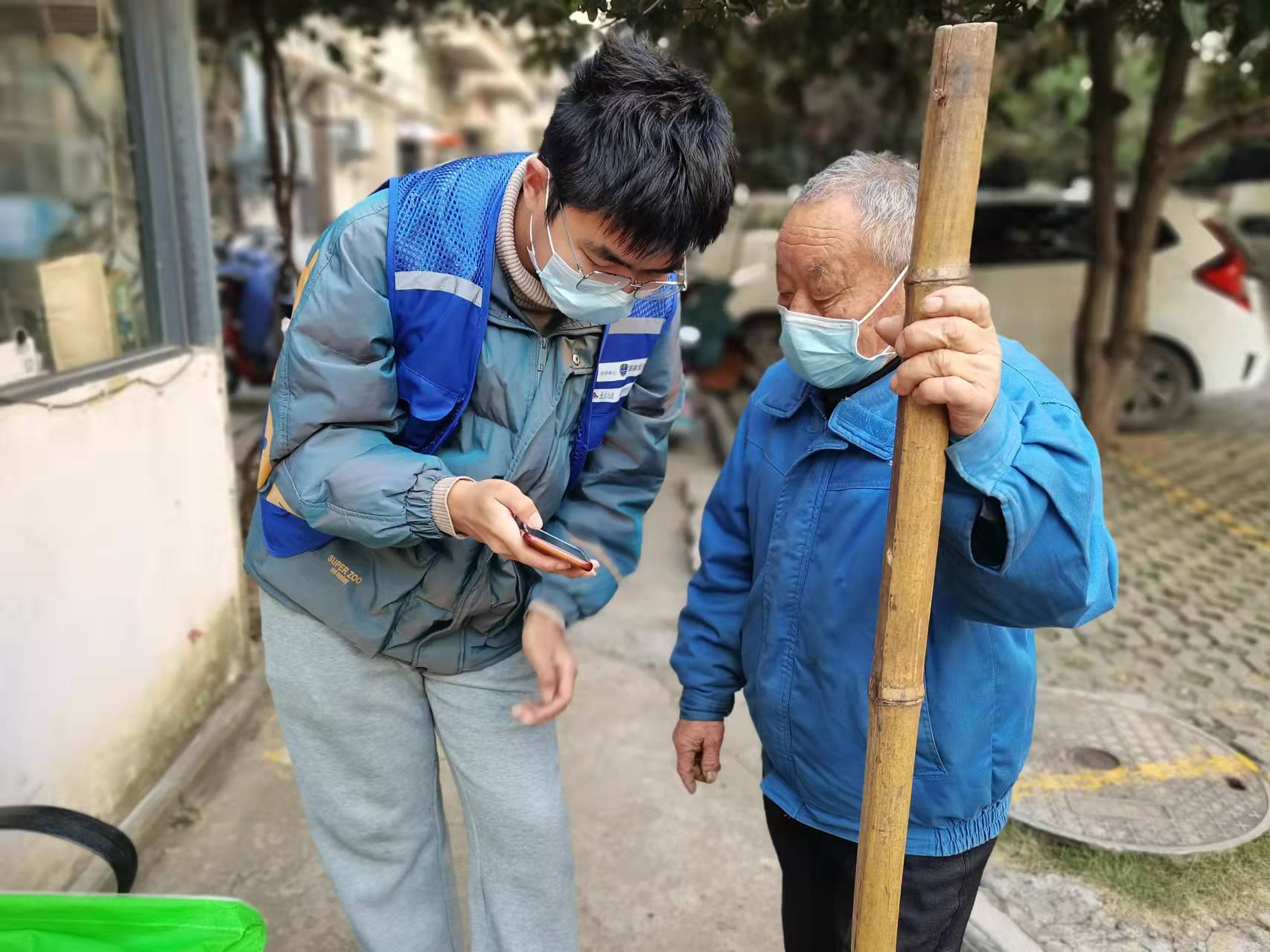 在慰问过程中, “蓝马甲”志愿者们正在引导社区老人如何使用电子医保卡。志愿者王梓航说,在这之前自己也不知道如何使用,在此次