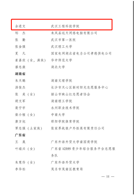 喜报!武汉工程科技学院余进文老师获评“第十三届中国青年志愿者优秀个人奖”!