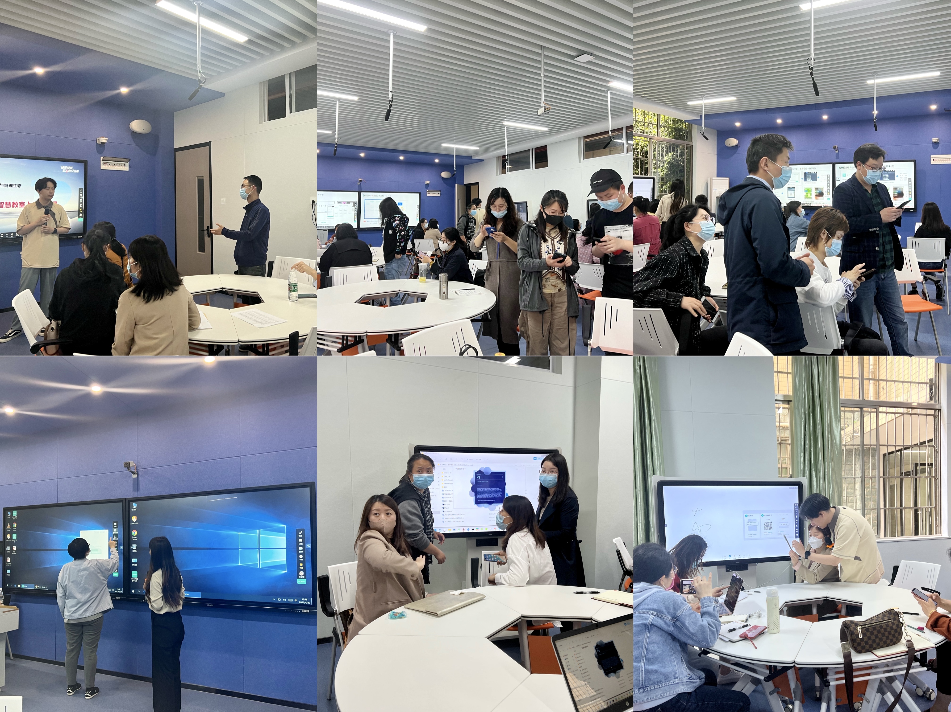 本次培训采用讲练结合的互动式培训方式。来自锐捷的培训讲师介绍了智慧教室的功能和智慧课堂环境,对智慧教室在研讨型教学中的实际应用以及常用功能的使用方法作了详细讲解,通过创建学习小组、答题讨论等环节与老师们进行了交流互动。期间,参加培训的老师们积极提问和参与,对智慧教室及其教学模式表现出极高的热情。老师们在操作端进行操作,了解并熟悉各种功能。针对实操中老师们出现的问题,技术人员及时进行现场指导。