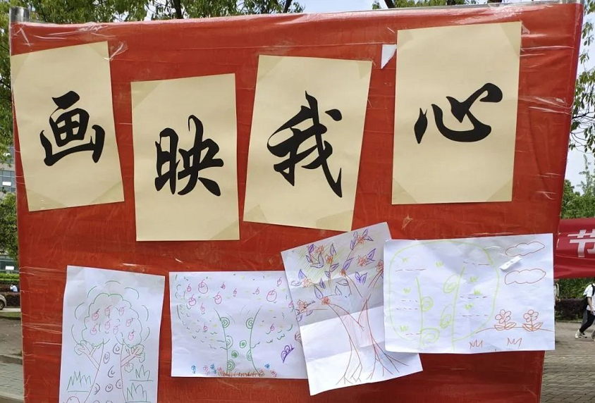 “画映我心”:同学们在白纸或者展板上画出一棵树,咨询师会对画作大小、空间配置、使用颜色、展现的形象等内容进行分析,帮助绘画者探索自身的情绪情感、冲突困惑,从而了解自我,疗愈自我,发展自我。期待解答的同学排成长队,等待着刘洁老师对其画卷的分析。