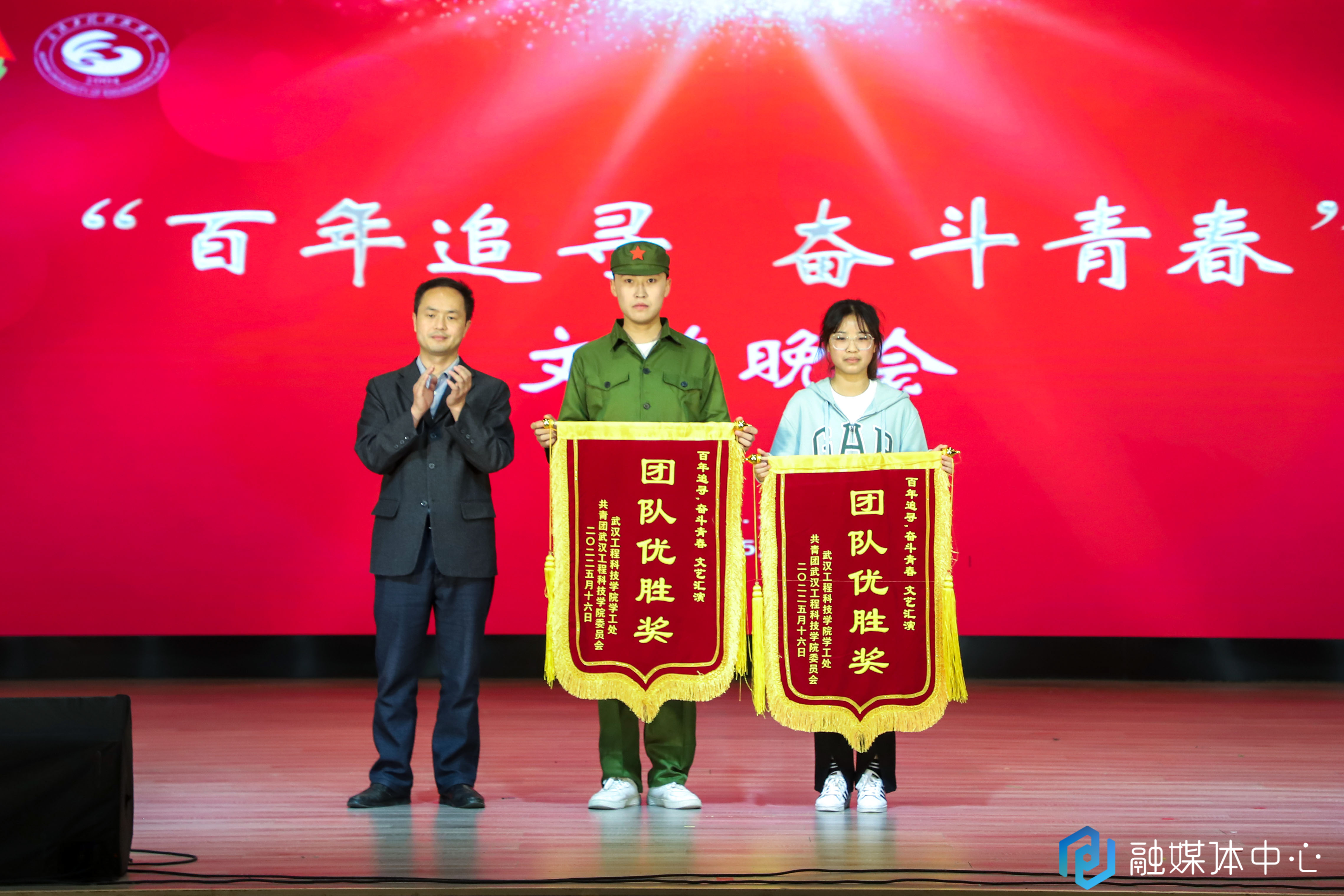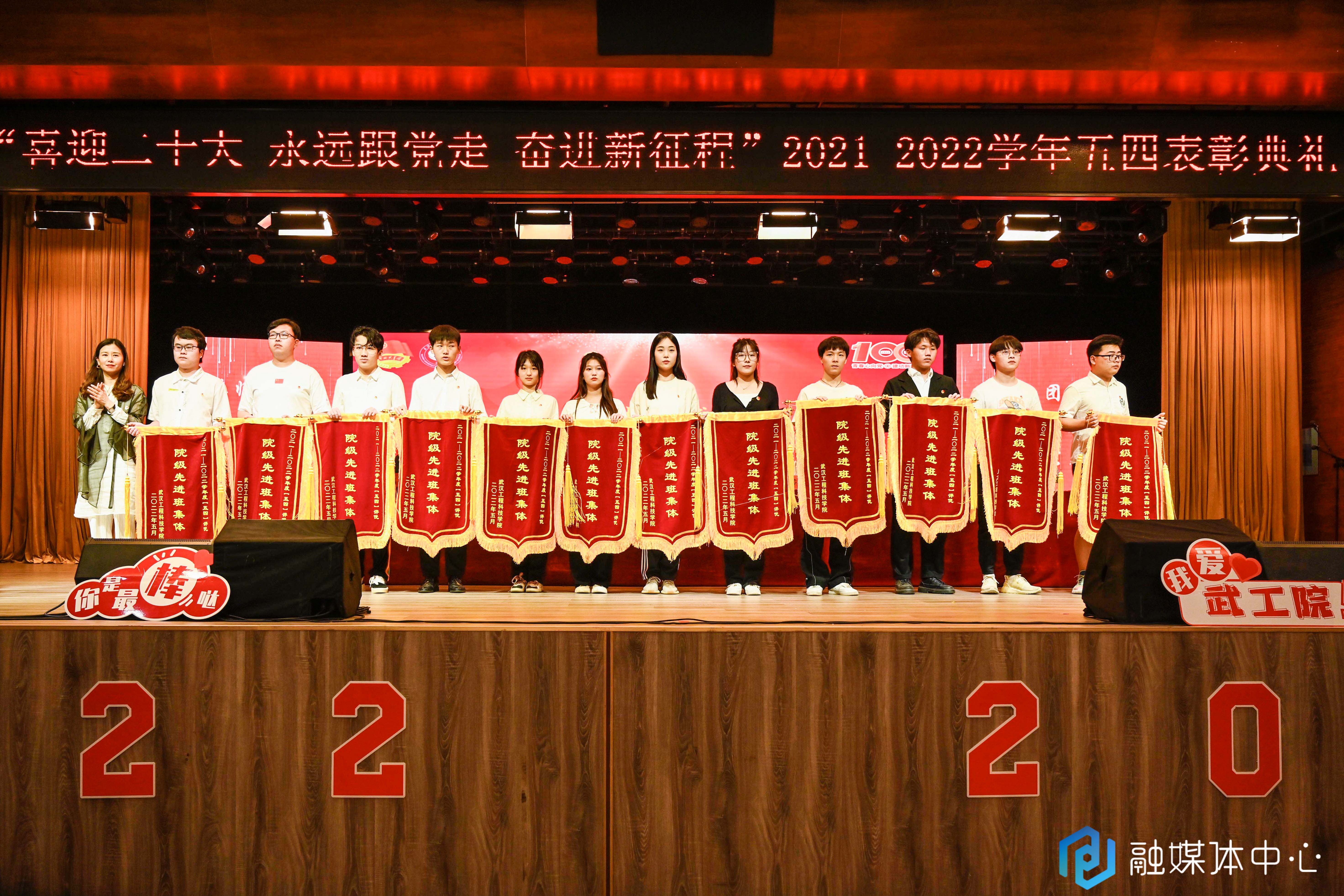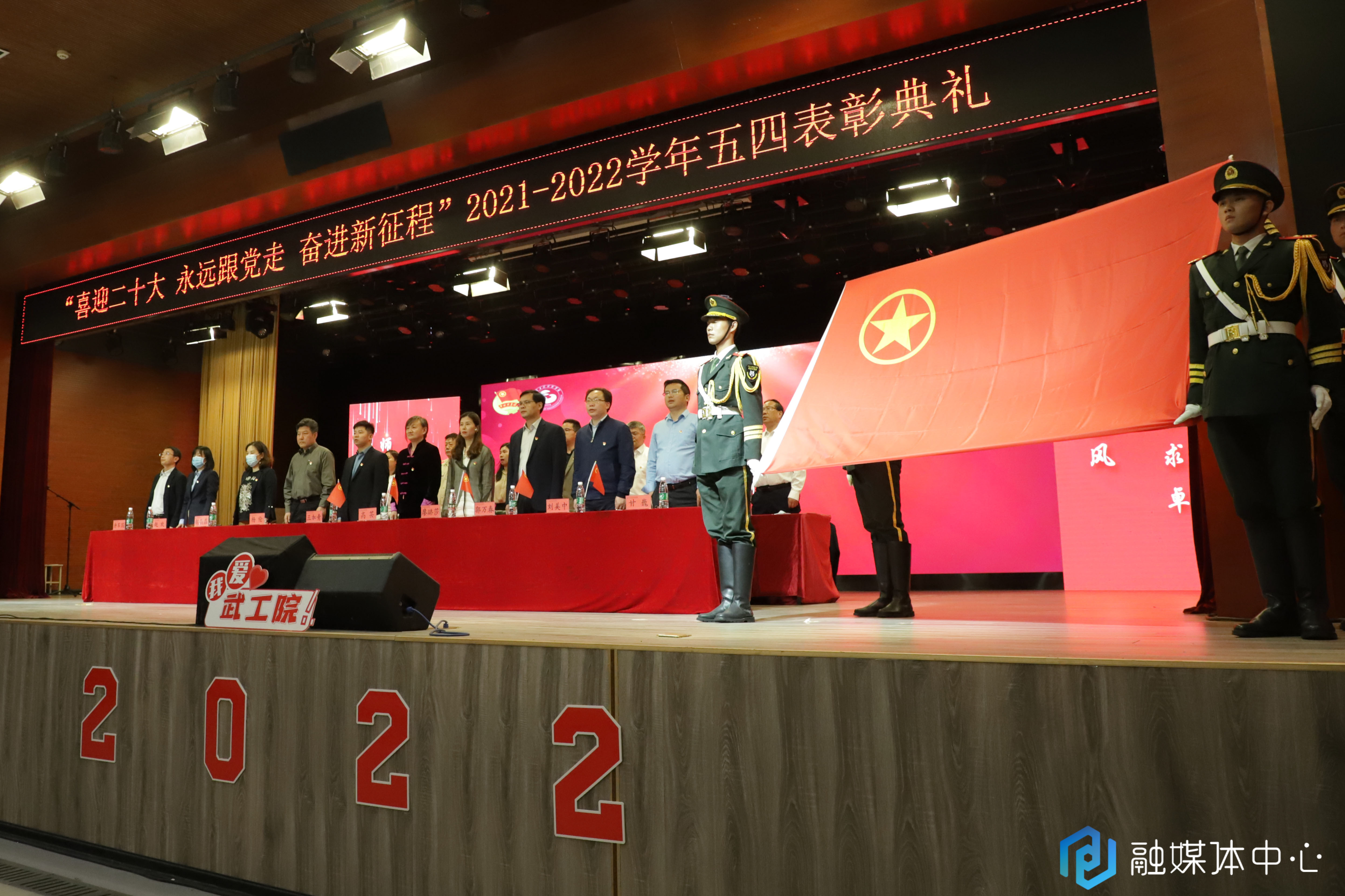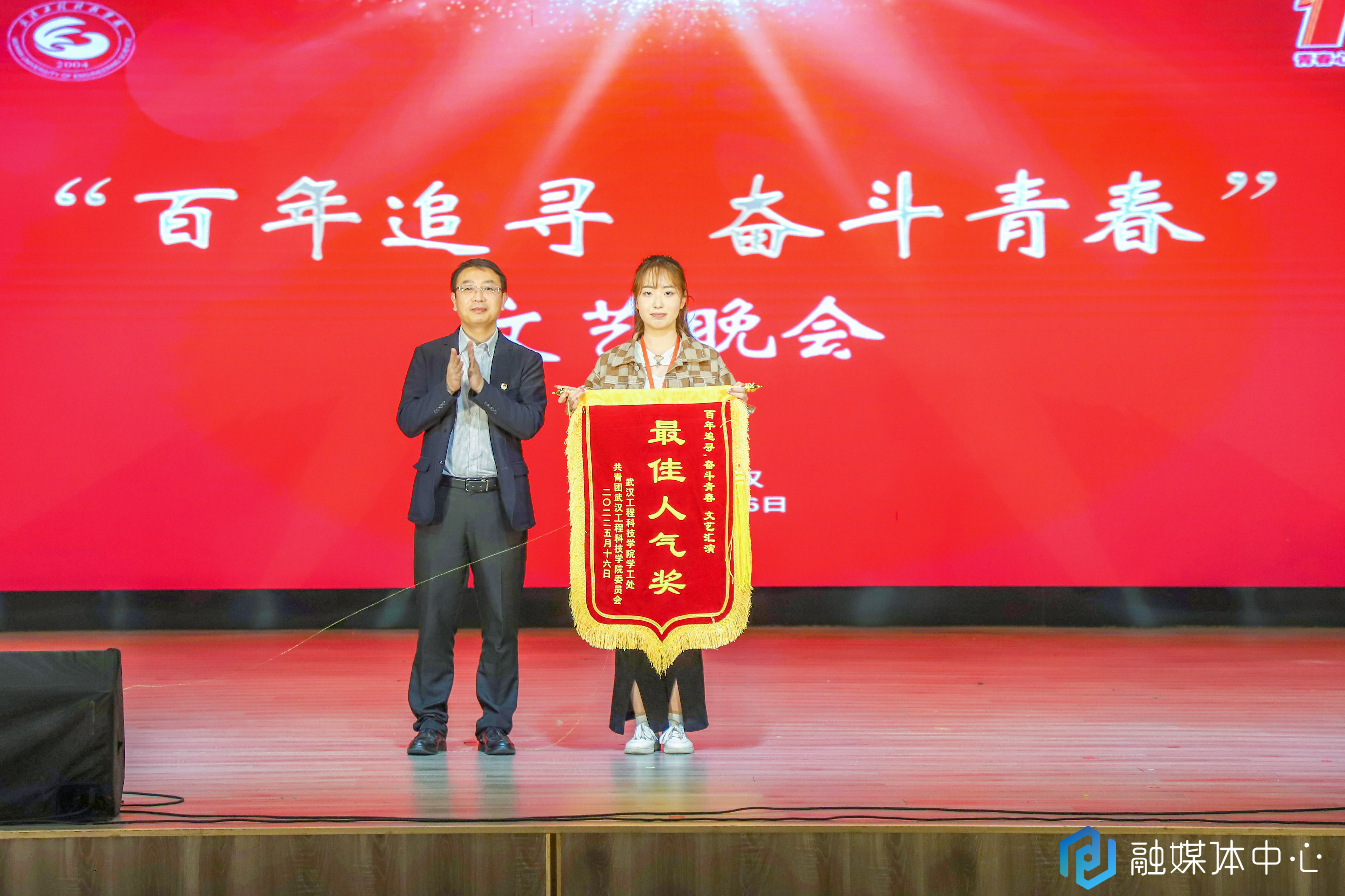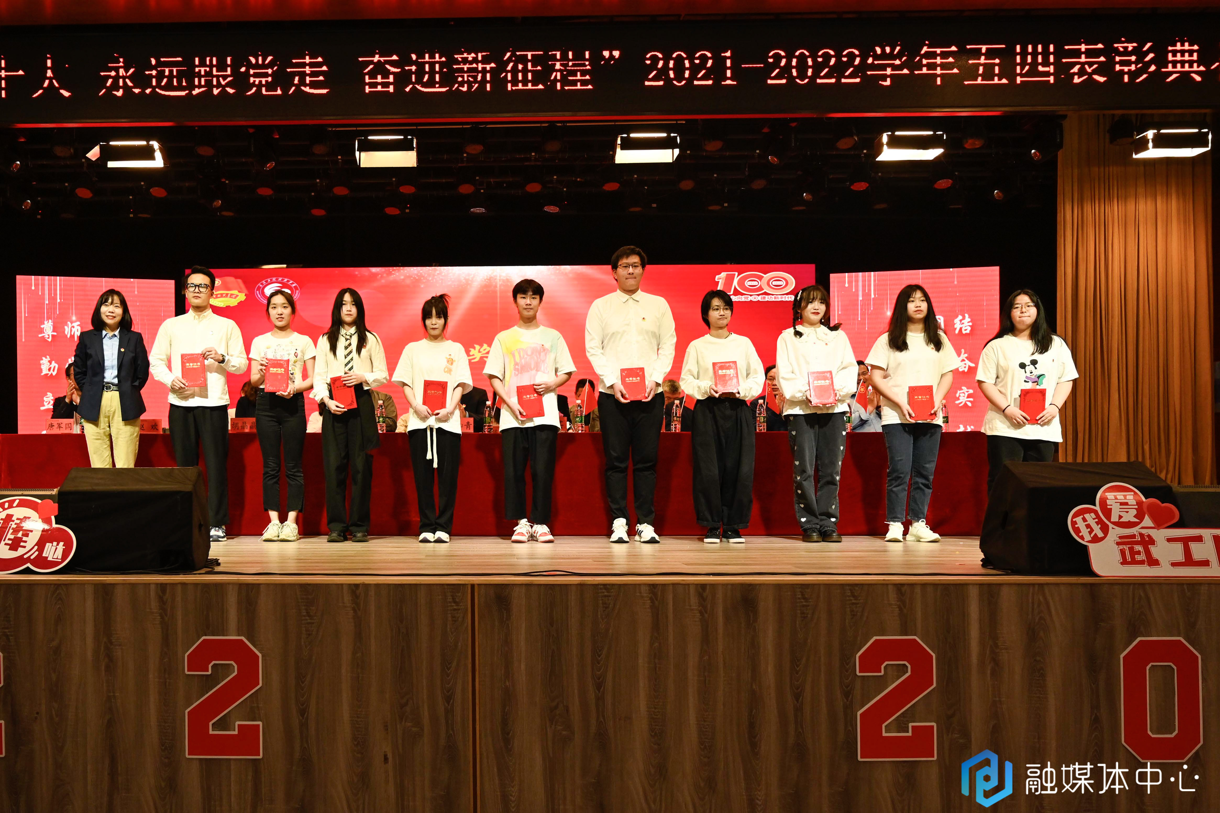 本网讯(大学生记者 徐彤晨 摄影:邱婉琪 潘力 饶晶宇 摄像:梅少菁 张茗 裴晟君 吴清凤)“青春孕育无限希望,青年创造美好明天。一个民族只有寄望青春、永葆青春,才能兴旺发达。”为庆祝中国共青团成立100周年,引导广大青年感悟自强精神,锤炼品德修养,奋进新时代,武汉工程科技学院“喜迎二十大,永远跟党走,奋进新征程”2021—2022 学年五四表彰典礼暨“百年追寻 奋斗青春”献礼建团百年文艺晚会于5月16日晚在三教报告厅举行。学校全体校领导,相关职能处室负责人,各学院党总支书记、团总支书记和师生代表参加了本次典礼。活动由学生工作处副处长、校团委书记钟晓星主持。