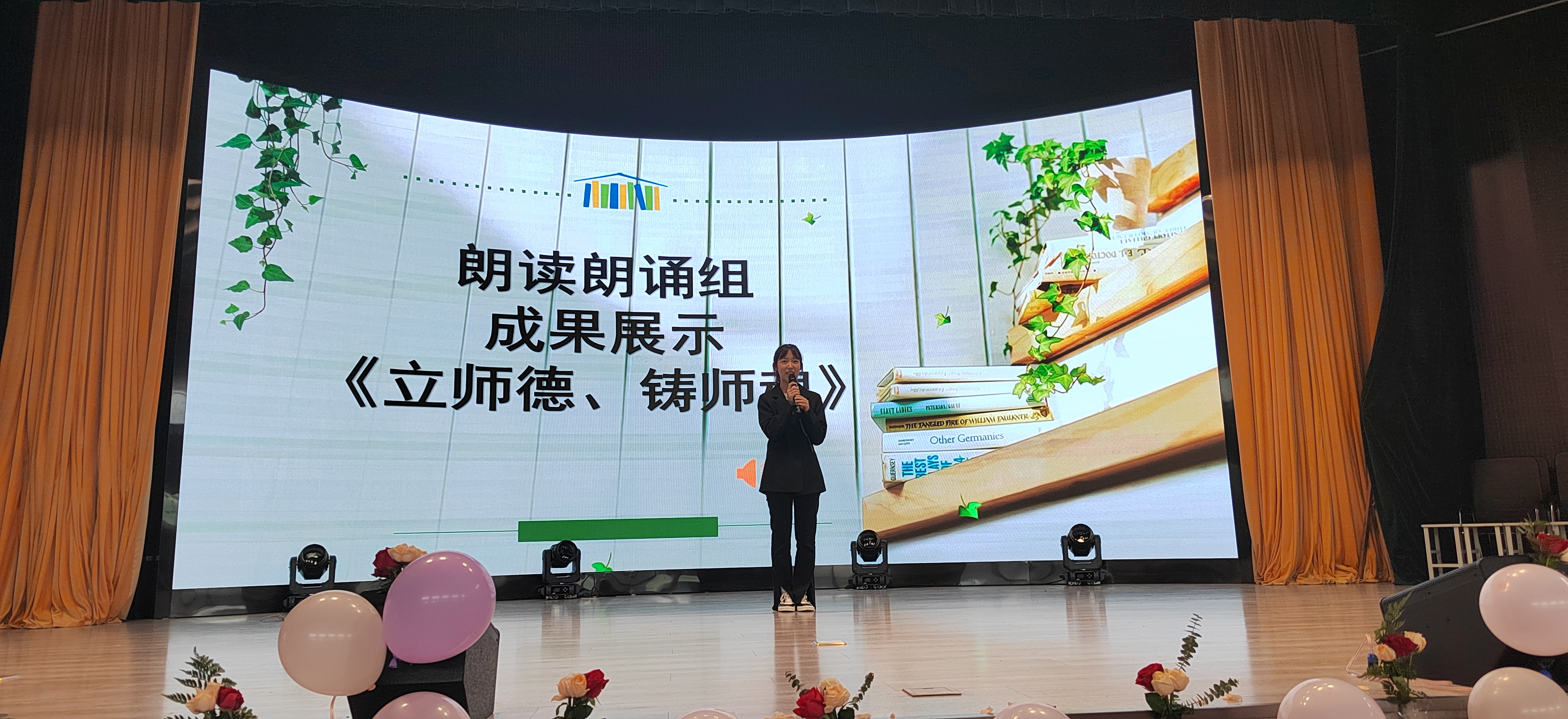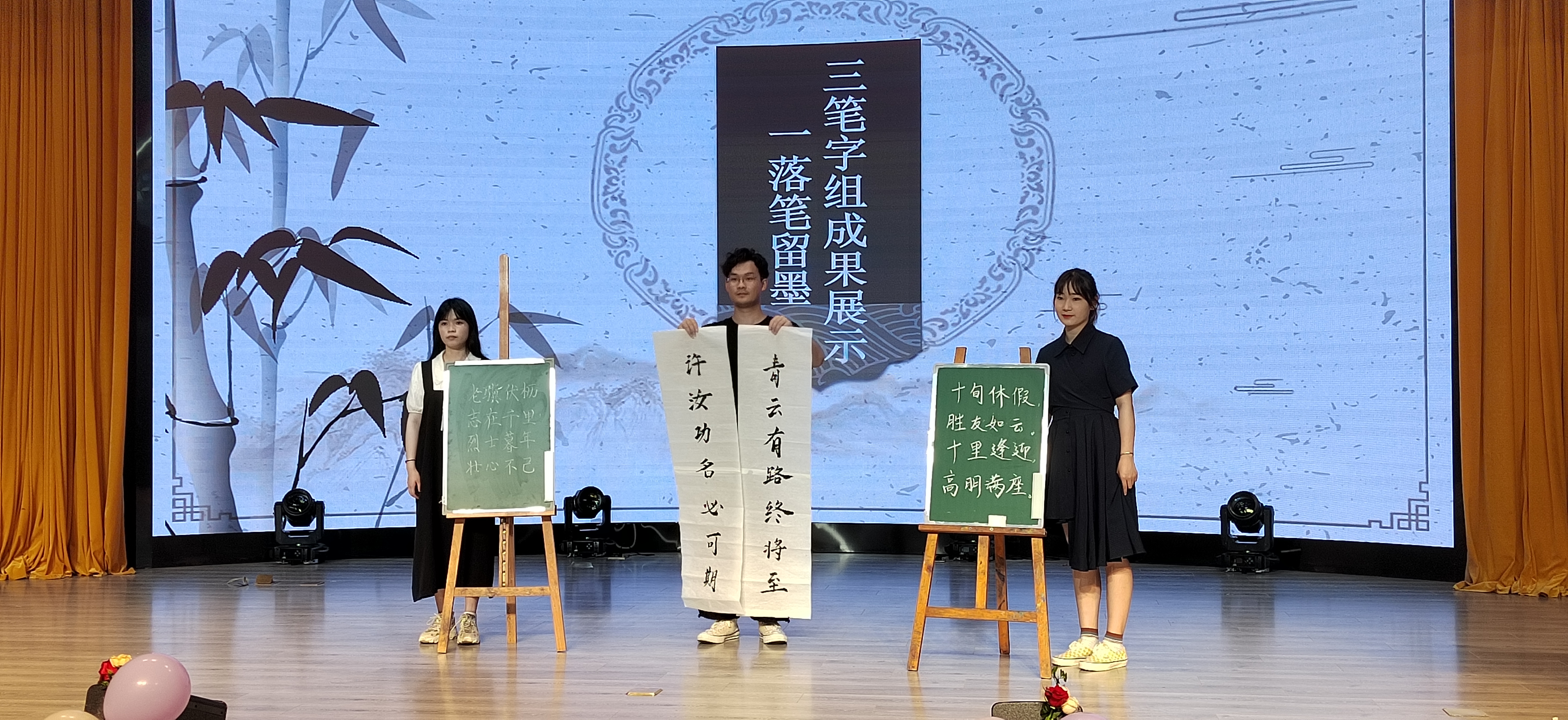 在汇演环节,朗读朗诵组带来的《立师德、铸师魂》为在场观众展现当代老师应具备的“师德”之风,三笔字成果展示组带来的《落笔留墨》,配合晏殊诗词《破阵子》的朗诵,粉笔字写成的曹操和王勃的诗句破笔而出,毛笔字作“青云有路终将至,许汝功名必可期”的诗句献给在场同学。课件制作组带来陆游的《临安春雨初霁》的课件展示,以四个方面入手,图文结合,逻辑严密。舞蹈组的《烟雨行舟•雨中花•繁花》,舞者执一伞,舞姿轻盈,灵动活泼,不同服饰和风格的舞蹈给现场各位带来一场视觉盛宴。教学技能组讲解《人之初》,课堂互动性强,知识发人深省,在儿歌弹唱组和《ZERO》合唱团的钢琴声和合唱声中,本次表彰活动也走到尾声。