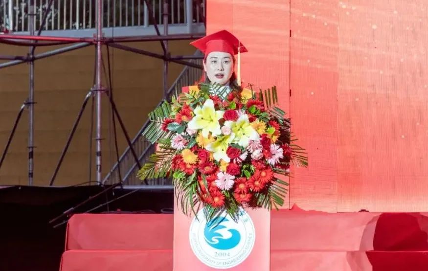 毕业生家长代表、武汉华顺人力资源服务有限公司总经理宁文娟发言。她十分感谢老师们对孩子的谆谆教诲和辛勤付出,四年里,孩子参加了各种社会实践活动,丰富了知识,增长了见识。她感慨:“看到孩子蜕变成长,变得更加成熟,取得了各项令人满意的成绩,我作为妈妈非常欣慰。拥有奋斗的青春,才是无悔的人生。”