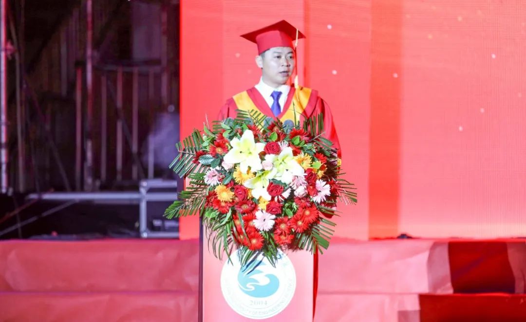 面对即将背起行囊、开启新征程的毕业生们,他以三句话与毕业生共勉:第一,不忘初心,永葆自信。要把自己活成一束光,自信坦荡,光芒万丈;第二,终身学习,持续成长。在这仅有一次的生命当中,很有必要去修行一些生命中的学分;第三,不弃微末,久久为功。他告诫同学们,要始终相信一点,放弃不难,但坚持一定很酷。
