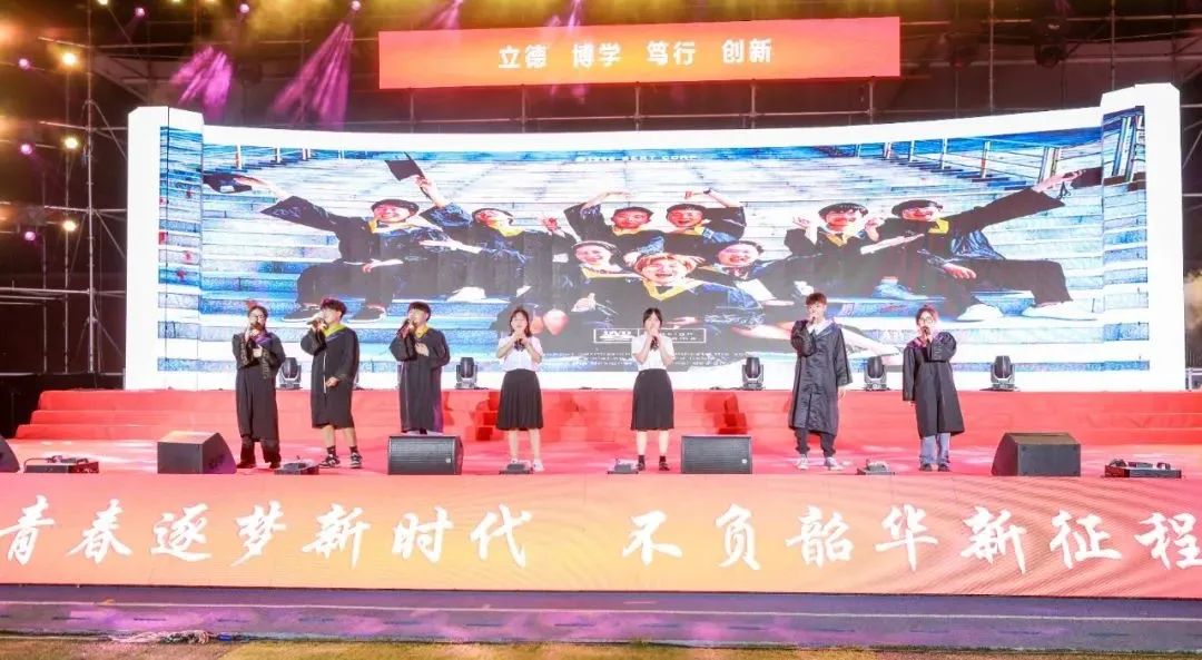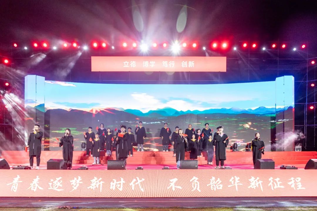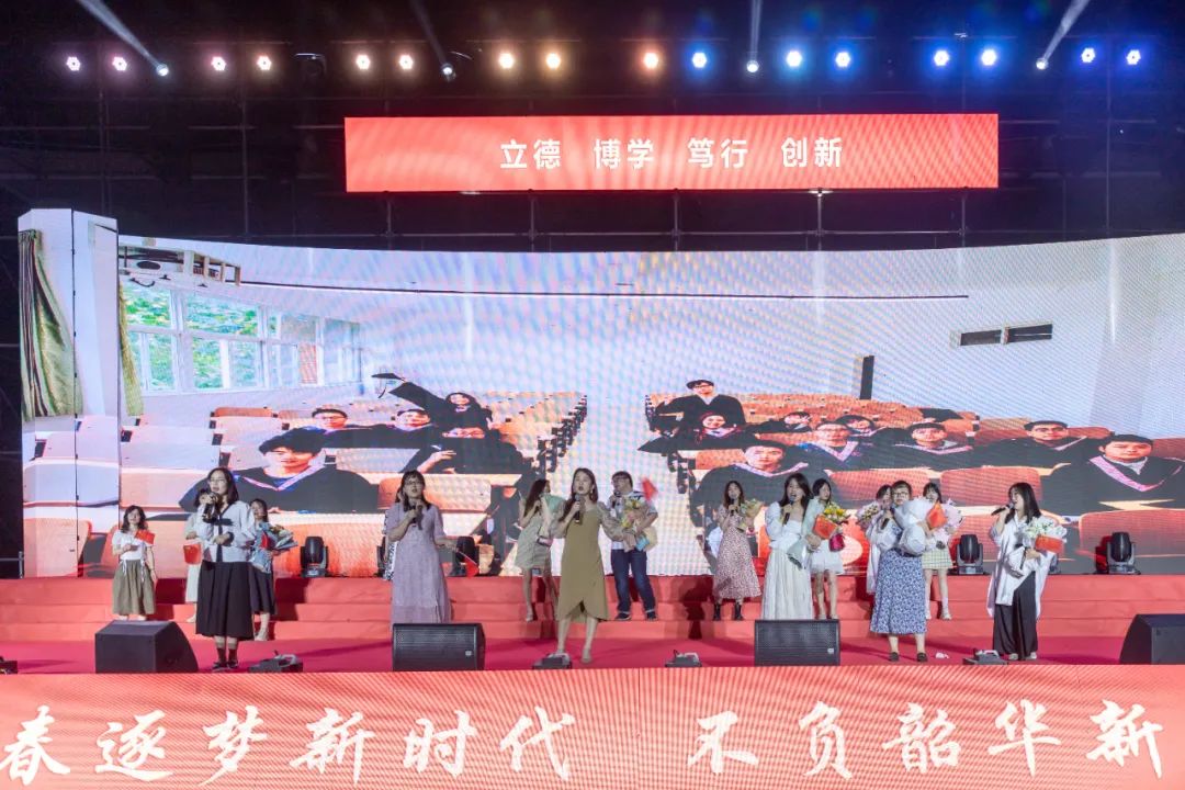 典礼最后,欢送毕业生的节目表演开始。各学院毕业生代表从观众席走出,歌唱《你曾是少年》,共同回忆曾经的大学生活。随后,各学院毕业生辅导员带来歌曲串烧,人文学院带来曲目《栀子花开》,带我们一起回忆青葱的校园时光;艺术与传媒学院歌唱《那些年》,期望毕业生能够从自己的大学经历中汲取精神力量;信息工程学院带来歌曲《小幸运》,告诉各位毕业生在忙碌的生活中,也要记得珍惜眼前人;经济与管理学院辅导员歌唱《再见》,寓意天下没有不散的宴席,也是向全体毕业生的深情告别。最后,学生集体合唱《我和我的祖国》,在“永远给我碧浪清波,心中的歌”的歌声中,武汉工程科技学院2022届毕业生毕业典礼圆满结束。