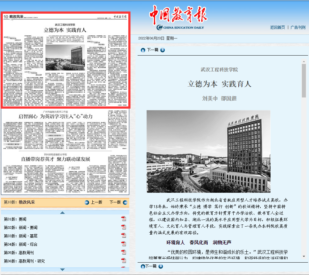 6月20日,中国教育报以《武汉工程科技学院:立德为本 实践育人》为题,用半个版面介绍我校落实立德树人根本任务、全面提升人才培养质量的育人经验及成果。