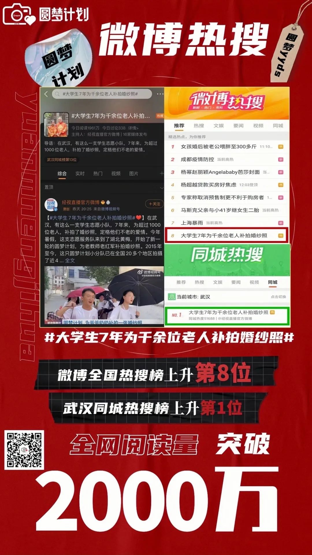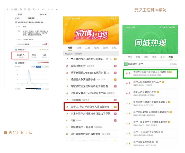 昨日,一则#大学生7年为千余位老人补拍婚纱照#话题火爆全网,微博全国热搜榜第八位,武汉同城热搜榜第一位,全网阅读量突破2000万。