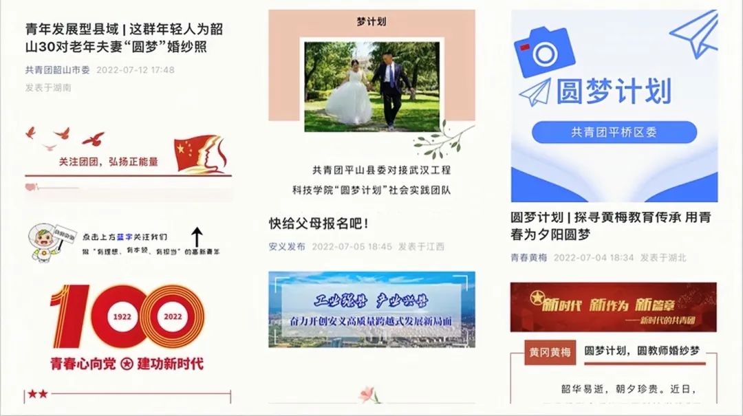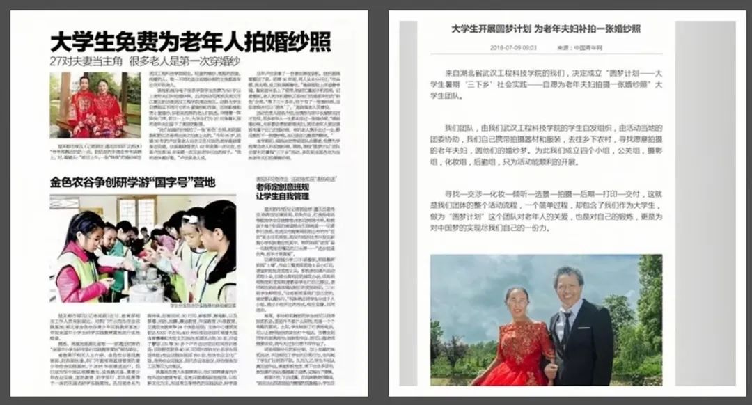 2022年,武汉工程科技学院圆梦计划团队完成升级,在为老年人补拍婚纱照的基础上,寻访乡村老教师、老红军和非遗传承人,为他们拍摄照片。活动引起社会热烈反响,人民日报、长江日报、湖南日报、华北日报、经济日报、农村日报、周口日报等日报,中国教育电视台、湖北电视台、湖南电视台,武汉教育电视台、石家庄电视台、黄梅电视台、项城电视台等电视台,共青团韶山市委、石家庄团委、石家庄高新区共青团、湖南军号、安义发布、青春平桥、青春黄梅、西柏坡青少年等公众号,人民网、中国经贸新闻、中国商报网大武汉、九江新闻网、东方早报网、中国经贸、信阳网、中华龙都网等网站,共百余家媒体进行全网全覆盖多形式密集报道。