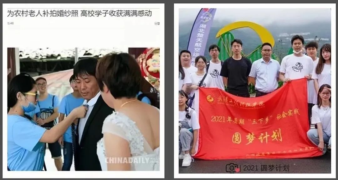 这群大学生来自武汉工程科技学院,是学校圆梦计划团队的成员。据悉,武汉工程科技学院圆梦计划团队成立于2015年,服务内容是公益为老年人补拍婚纱照,圆老人婚纱梦。七年来,圆梦计划团队的足迹遍布全国20多个地区,为超过1000位老人补拍婚纱照,拍摄近4万张照片,定格他们的不老爱情故事。