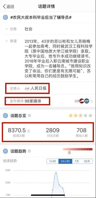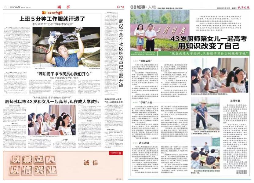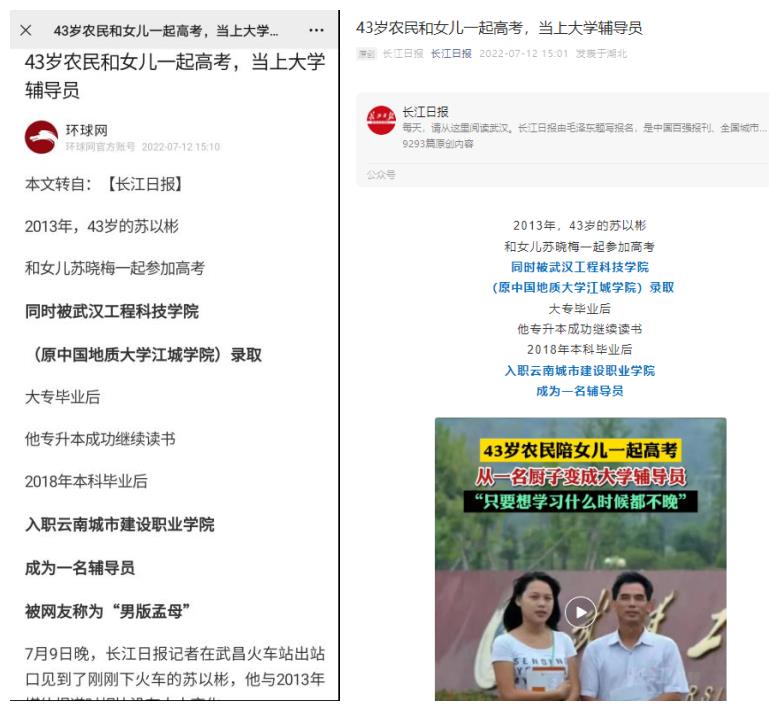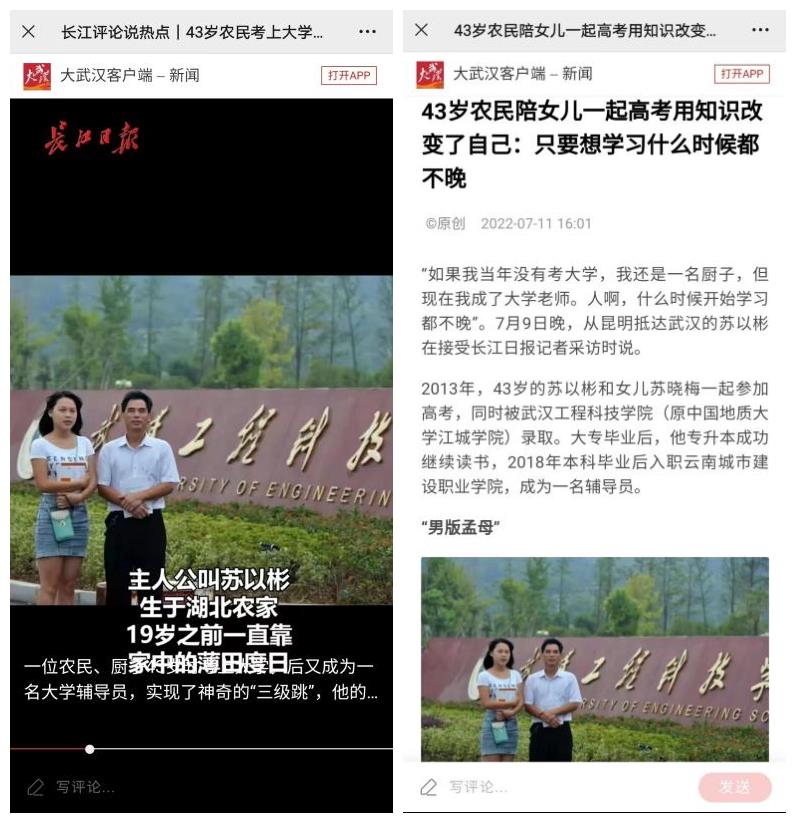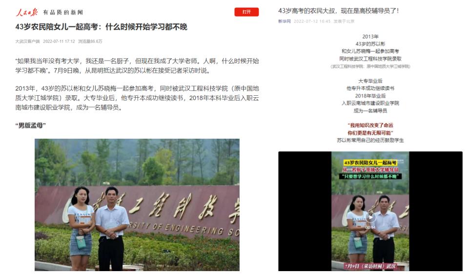 近日,43岁的苏以彬和女儿苏晓梅在2013年一起参加高考,同时被我校录取,并在大专毕业后成功专升本,于2018年本科毕业后入职云南城市建设职业学院,成为一名辅导员的励志故事被多家媒体报道,冲上微博热搜,并引发网友热烈讨论。