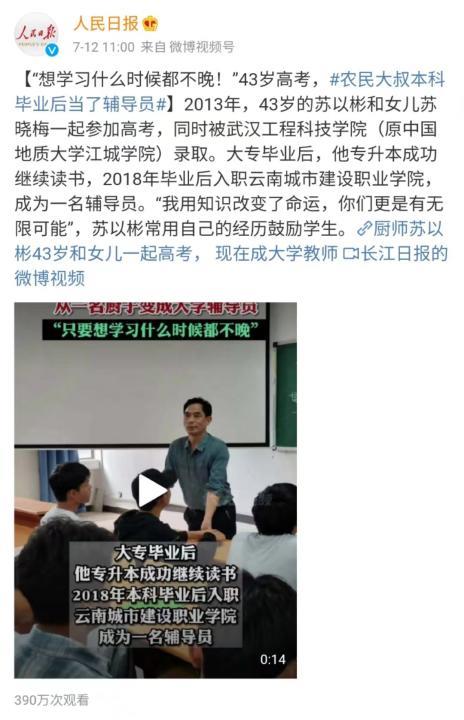 近日,43岁的苏以彬和女儿苏晓梅在2013年一起参加高考,同时被我校录取,并在大专毕业后成功专升本,于2018年本科毕业后入职云南城市建设职业学院,成为一名辅导员的励志故事被多家媒体报道,冲上微博热搜,并引发网友热烈讨论。