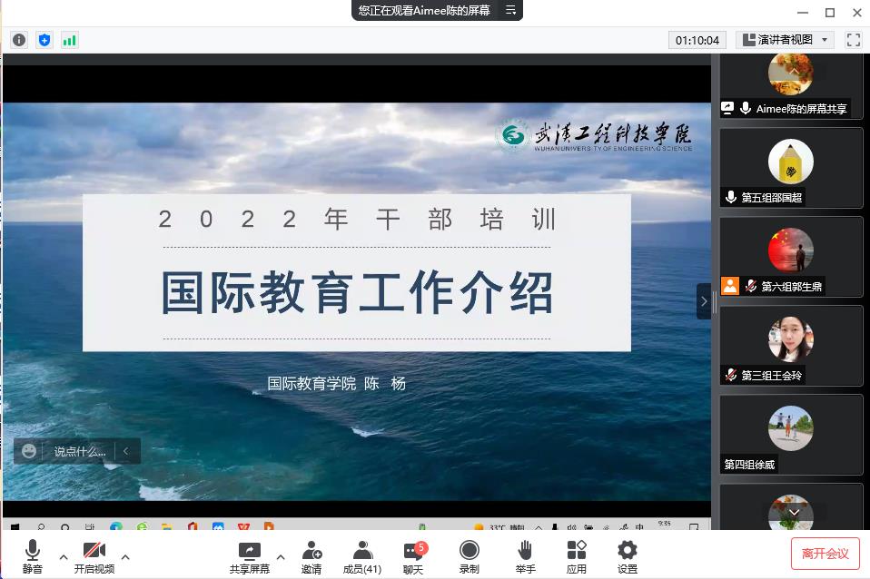 国际化教育工作是学校办学的重要战略部署,为推进国际化工作进程,提升国际化教育业务能力, 8月7日上午,武汉工程科技学院第二期干部培训班举行国际化教育线上专题培训。学校国际教育学院院长陈杨为培训班做专题讲座,第二期干部培训班全体学员参加培训,培训由人文学院副院长、第二期干部培训班班长郭生鼎主持。