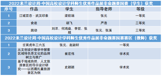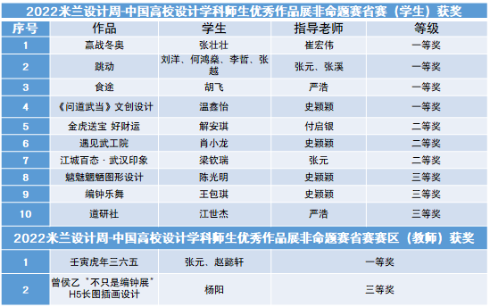 6月上旬,2022米兰设计周—中国高校设计学科师生优秀作品展结果揭晓,我校艺术与传媒学院参赛师生获全国决赛一等奖2项、三等奖2项、学术奖2项。湖北省赛区一等奖5项、二等奖3项、三等奖4项。