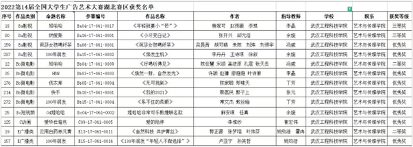 8月中旬,第十四届全国大学生广告艺术大赛湖北赛区结果公示结束,我校艺术与传媒学院学子共有13件作品获奖,其中二等奖2项、三等奖2项、优秀奖9项。获奖作品类型涵盖影视类、动画类、广播类,获奖数量较往年再创新高。