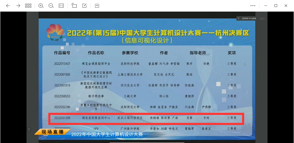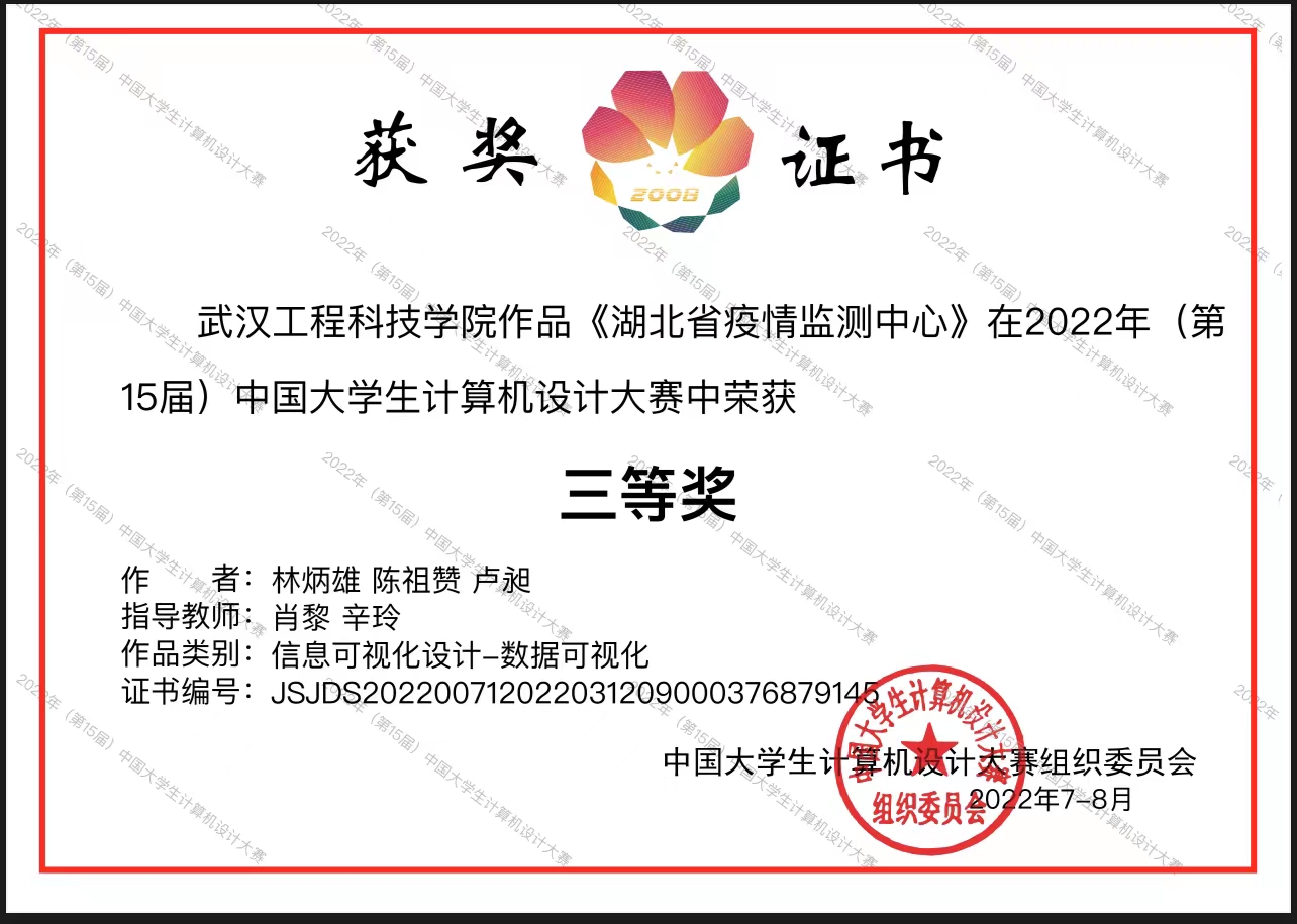 在决赛中,由信息工程学院教师肖黎、辛玲指导,林炳雄(数据科学与大数据技术专业2019级学生)、陈祖赞(数据科学与大数据技术专业2019级学生)、卢昶(数据科学与大数据技术专业2019级学生)三名同学所创作的作品《湖北疫情监测中心》经过答辩、作品展示、评委点评,荣获国家三等奖。