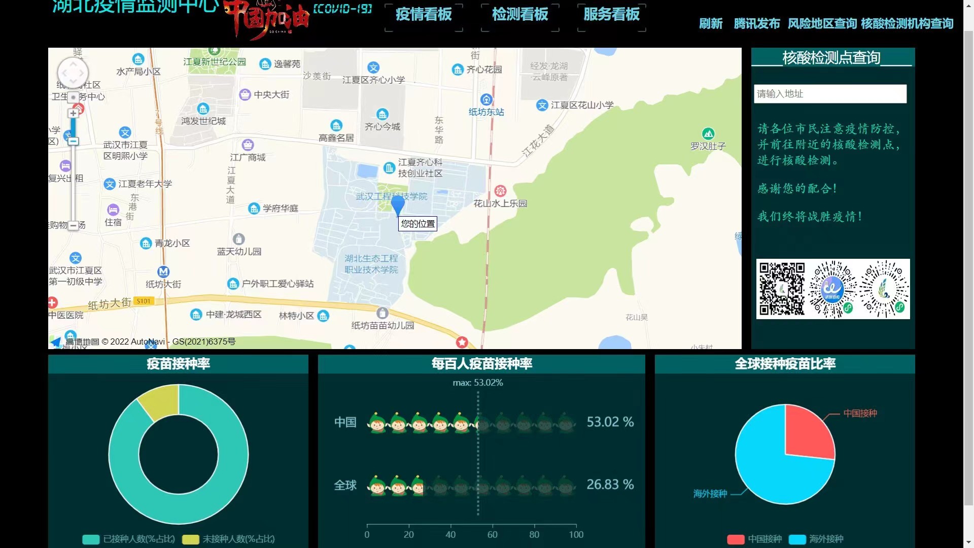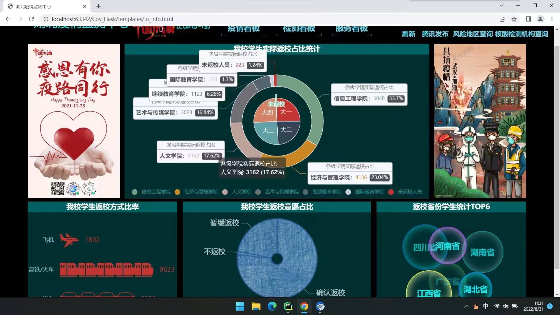 该作品基于Flask框架,利用Python爬虫技术等,对湖北省新冠肺炎疫情数据分别进行统计并生成直观、全面的各项图表,湖北省内都可以以第一时间了解疫情数据,帮助社会工作者分析疫情做出决策,也方便用户对自身所处地区进行防控判断。作品特点直观简洁,方便用户使用和日常抗疫需求,对疫情严重地区能在地图上直观表现出,作品结合时代背景和简便了解疫情的特点下,对用户进行抗疫宣传和便民服务,直观清晰简洁查看疫情数据、图表等操作更加便民化。
