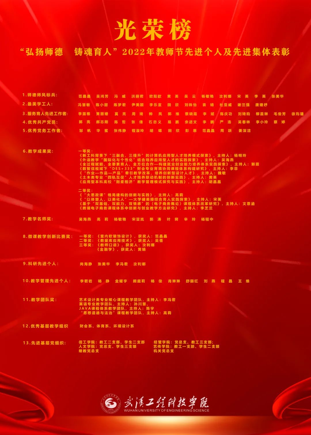 在第38个教师节来临之际,为进一步弘扬尊师重教的良好风尚,增强学校教职工的荣誉感和责任感,激励广大教师、教育工作者投身学校教育教学改革的工作热情,推动学校教育事业蓬勃发展,学校评选出了2022年教师节先进集体和先进个人,并予以表彰。
