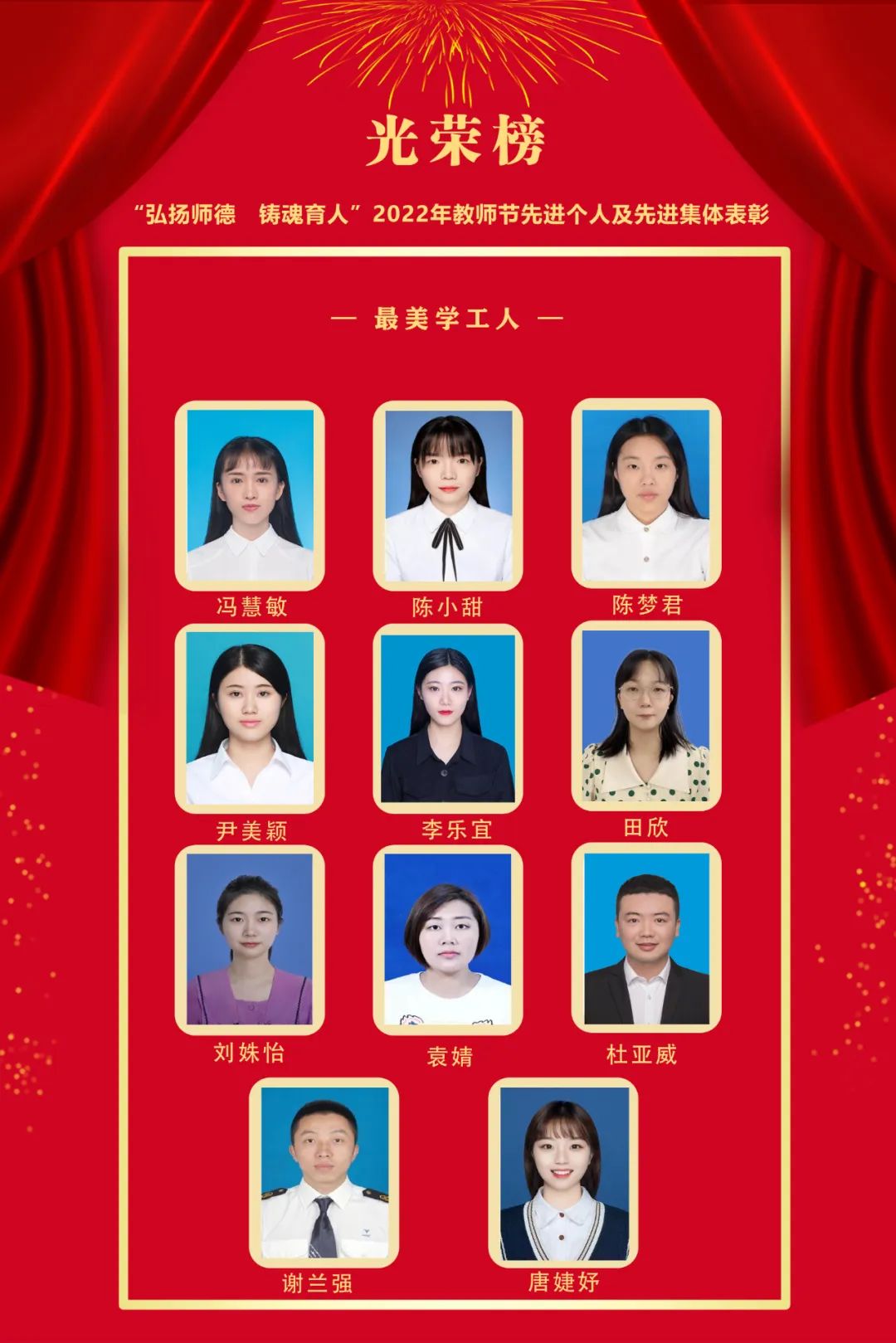 获奖者分别是:冯慧敏、陈小甜、陈梦君、尹美颖、李乐宜、田欣、刘姝怡、袁婧、杜亚威、谢兰强、唐婕妤