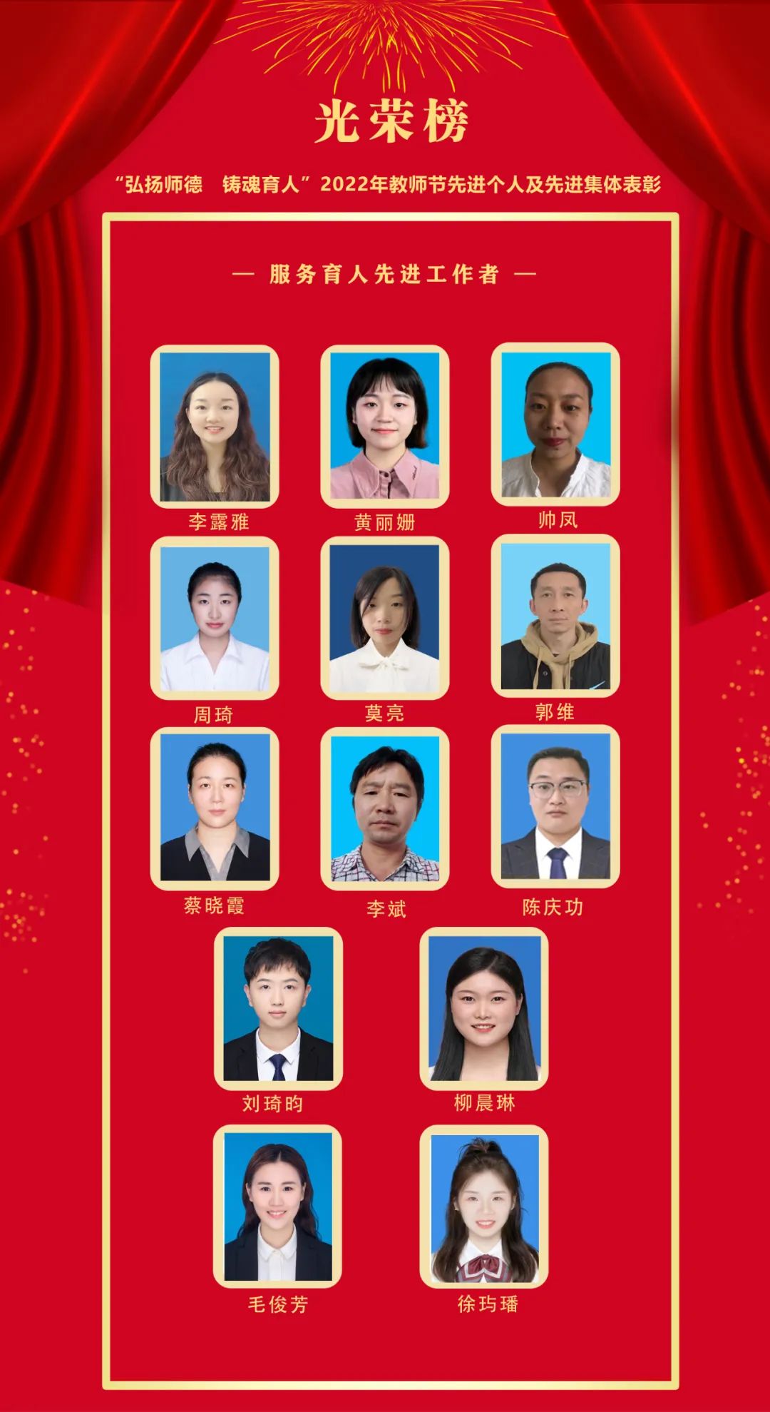 获奖者分别是:李露雅、黄丽姗、莫亮、周琦 、帅凤、郭维、蔡晓霞、李斌、陈庆功、刘琦昀、柳晨琳、毛俊芳、徐玙璠